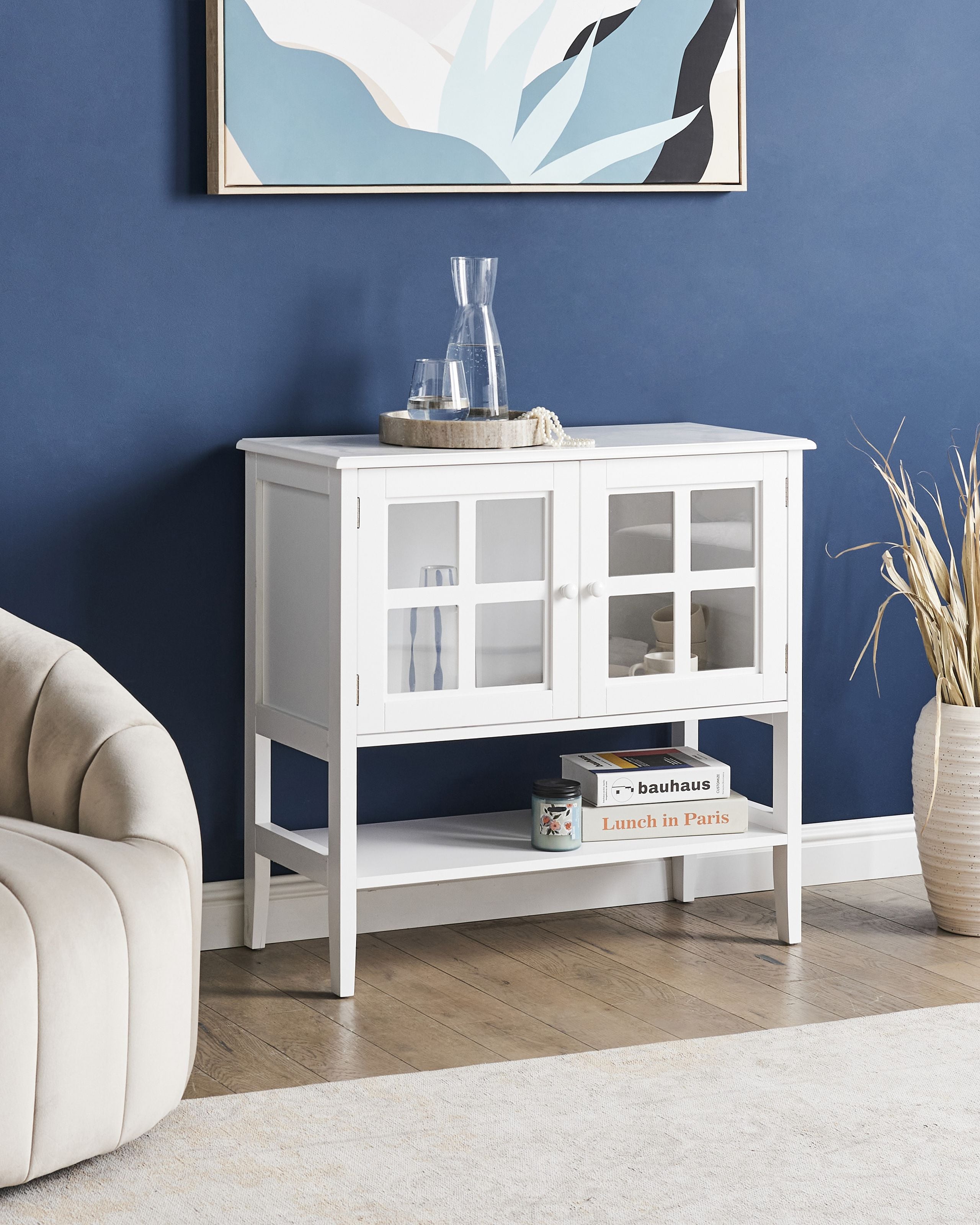 Välimerellinen kaappi lasiovilla ja avohyllyllä. Tämä vitriinikaappi on toimiva ja viehättävä lisä kotiisi hillityn valkoisen viimeistelynsä ja tyylikkäiden lasioviensa ansiosta. Leveä taso sopii täydellisesti koriste-esineiden esittelyyn, kun taas kaappi ja alaosassa sijaitseva avohylly tarjoavat runsaasti säilytystilaa erilaisille tavaroille. Ajaton muotoilu sulautuu saumattomasti sekä moderneihin että perinteisiin sisustuksiin, tuoden niihin kauneutta ja käytännöllisyyttä.