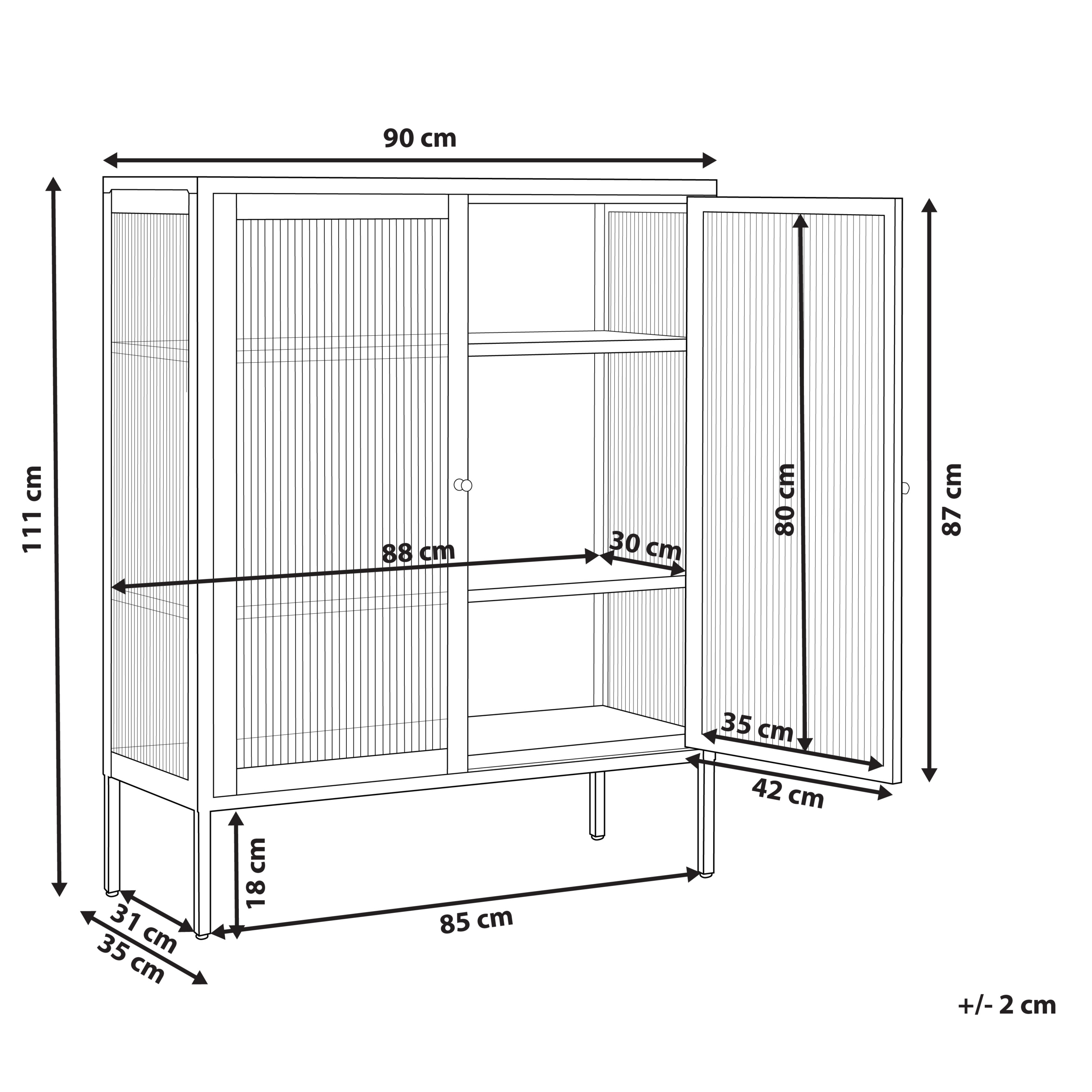 Ylellinen astiakaappi lasiovilla. Viimeistele ruokailutilasi tai olohuoneesi sisustus tällä koristeellisella senkillä. Kahdella ovella varustettu vitriinikaappi tarjoaa paljon tilaa erilaisten koristeiden, astioiden tai kirjojen esittelyyn. Uurretusta lasista valmistetut ovet ja sivut luovat ainutlaatuisen, katseita keräävän vaikutuksen, jonka ansiosta senkki erottuu edukseen missä tahansa sisustuksessa. Astiakaapin runko on valmistettu teräksestä, joka takaa vakauden sekä kestävyyden. Teräksen musta mattaviimeistely antaa senkille glamourisen ilmeen.