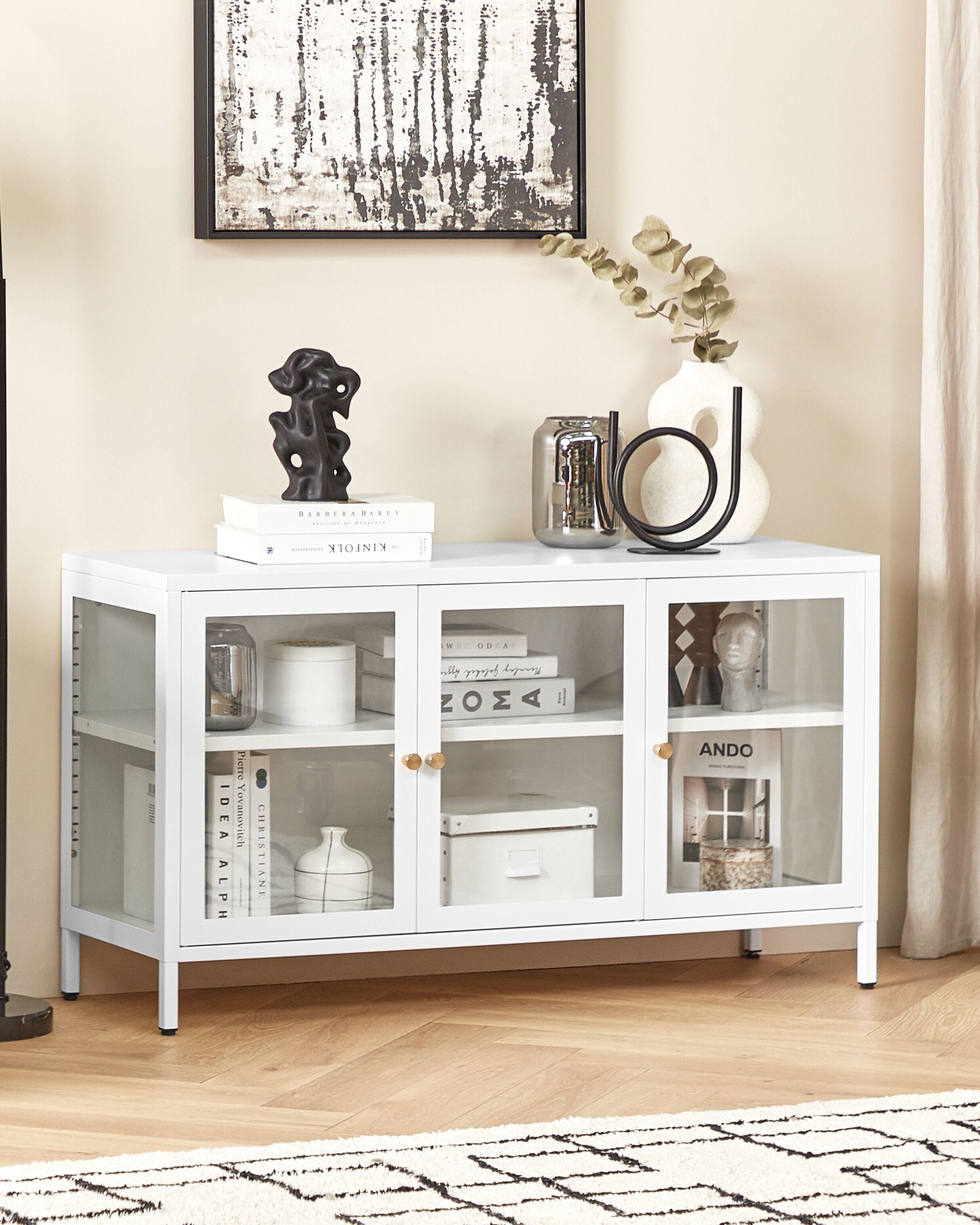 Moderni kappi lasiovilla. Tämä tyylikäs senkki on loistava säilytysratkaisu mihin tahansa eteiseen, olohuoneeseen tai kotitoimistoon. Tukeva teräsrunko tekee siitä sekä vakaan että pitkäikäisen. Karkaistujen lasiovien taakse sijoitetut tilavat hyllyt tarjoavat runsaasti säilytystilaa kirjoille, astioille ja koriste-esineille. Vitriinikaappi sopii erinomaisesti erityisesti moderneihin sisustuksiin.