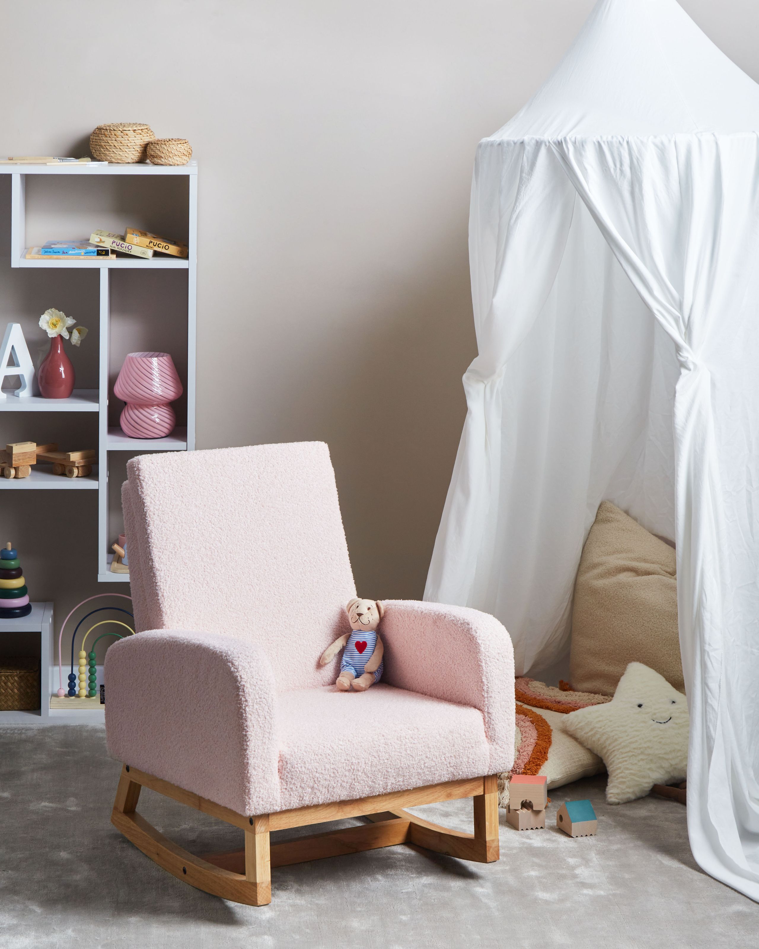Skandinaavinen lasten keinutuoli korkealla selkänojalla. Anna lapsesi rentoutua tyylillä tässä viehättävässä keinutuolissa. Kotoisalla, teksturoidulla bukleekankaalla verhoiltu ja tukevilla kumipuujaloilla tuettu keinutuoli sopii erinomaisesti satuhetkiin, rauhoittumiseen tai vain lempeään keinutteluun leikkipäivän jälkeen. Korkea selkänoja antaa lisätukea, tehden keinutuolista mukavan ja turvallisen paikan, jossa lapset voivat rentoutua ja latautua.