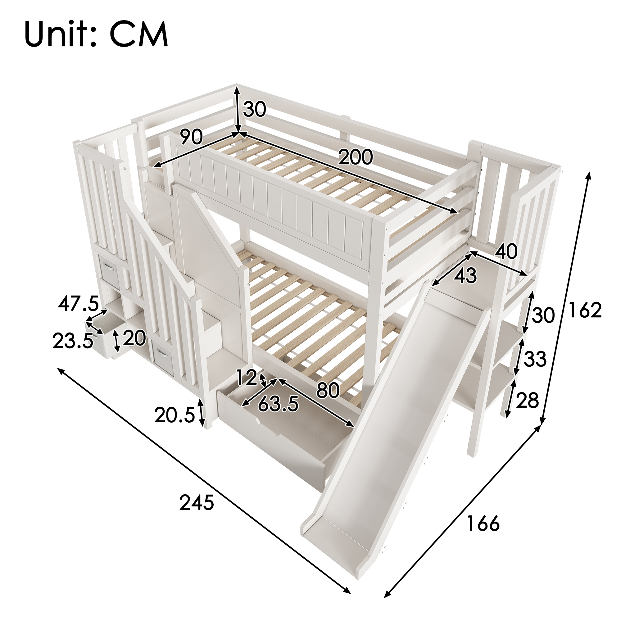 Lasten kerrossänky 90x200 cm, liukumäki, tikkaat, laatikot, hylly, säleet, valkoinen, ei patjaa