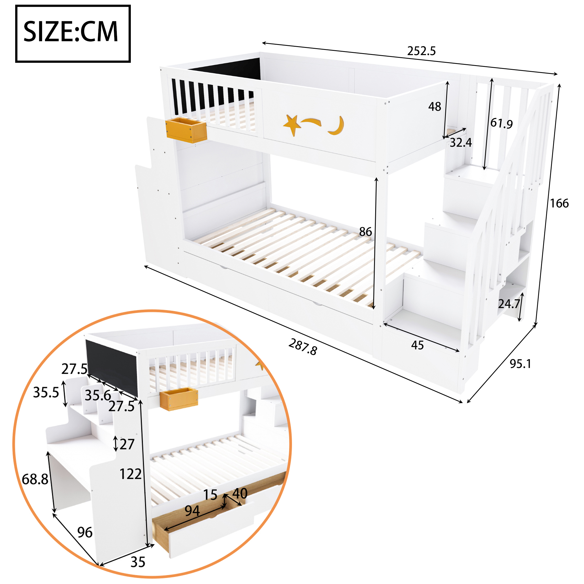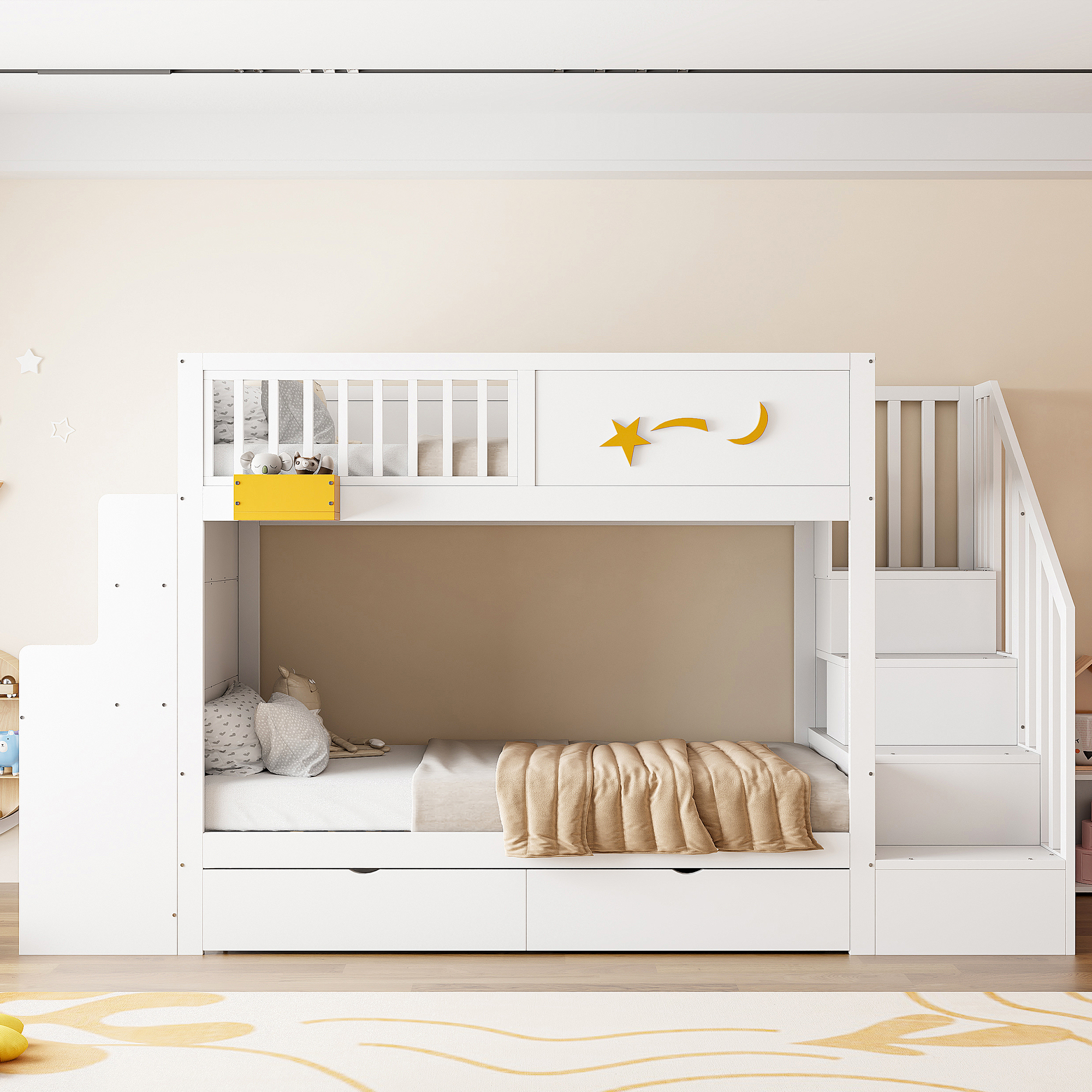 TURVALLINEN PORTAAN MUOTOILU: Sängyn oikealla puolella olevat turvaportaat mahdollistavat lapsesi turvallisen ja helpon kiipeämisen ylimpään kerrossänkyyn. Jokainen askelma tarjoaa lisää säilytystilaa.