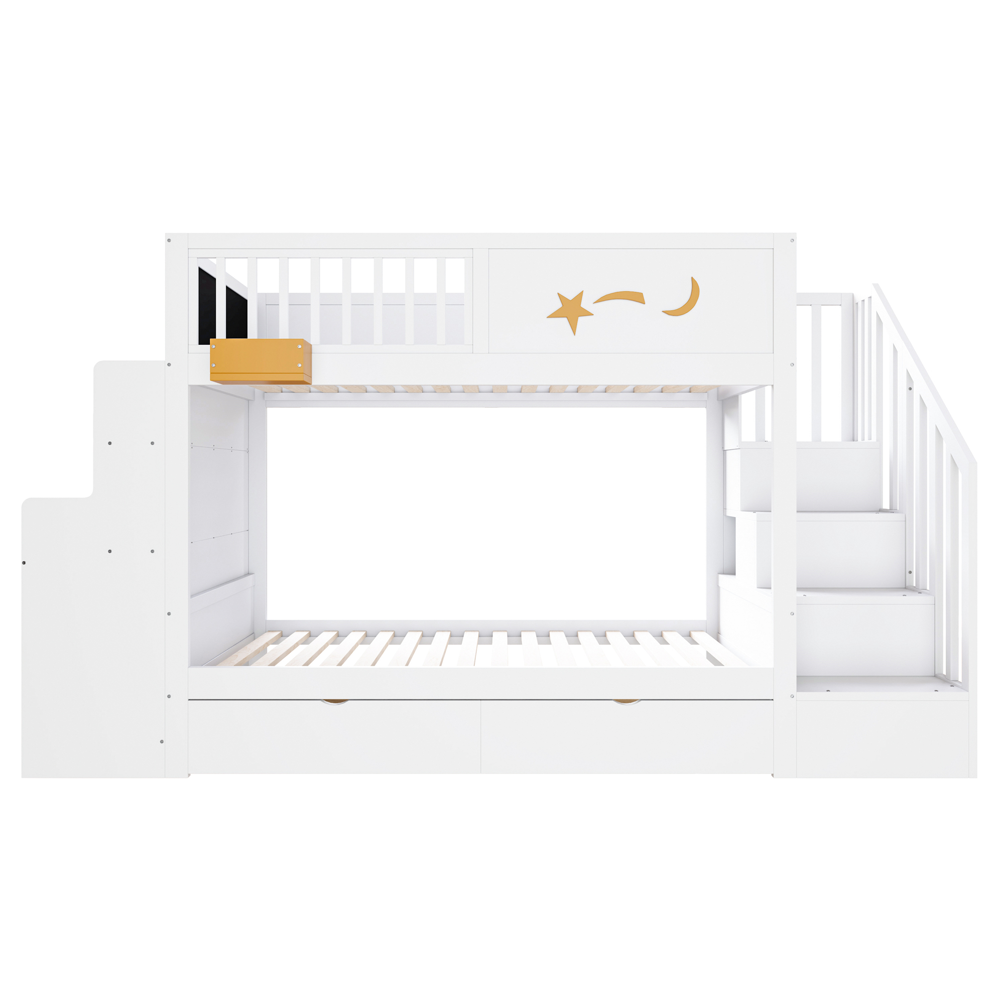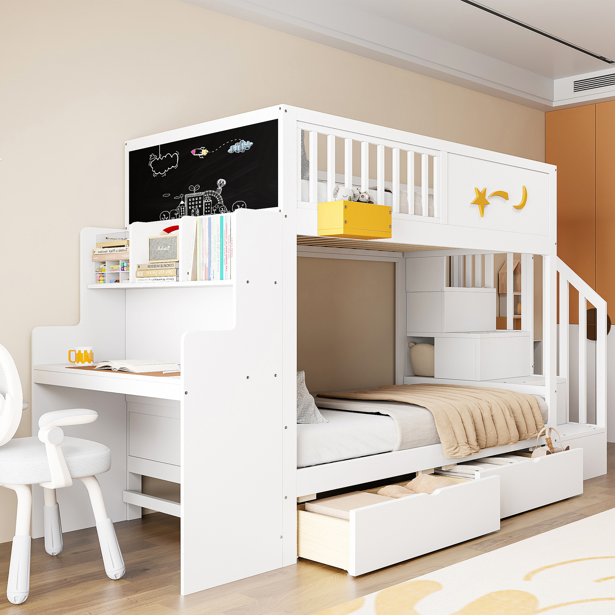 Lasten kerrossänky, 90x200 cm, mänty, laatikot, portaat, työpöytä, tähti, valkoinen