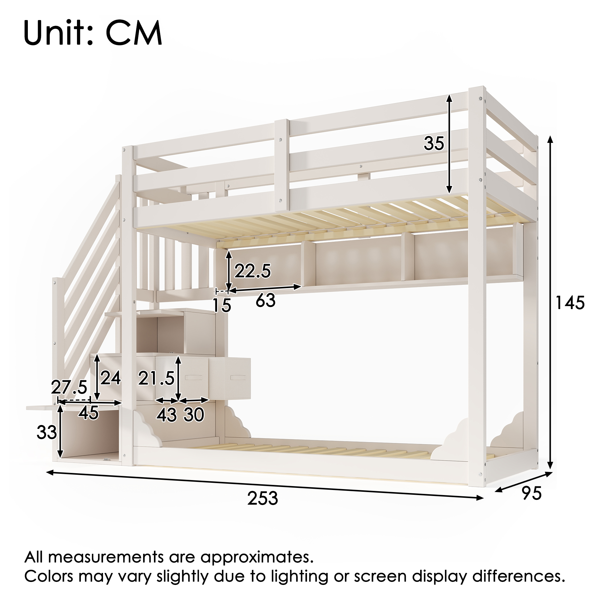 【Käytännöllisyys kohtaa luovuuden】Tämä valkoinen kerrossänky yhdistää toiminnallisuuden ja luovuuden. Alemmassa makuutilassa on pilvenmuotoinen koristelista, kun taas yläosassa on turvakaide joka puolella. Sivussa olevassa porraskaapissa on korkea turvakaide, joka varmistaa lasten turvallisuuden kiipeämisen aikana ylös ja alas.