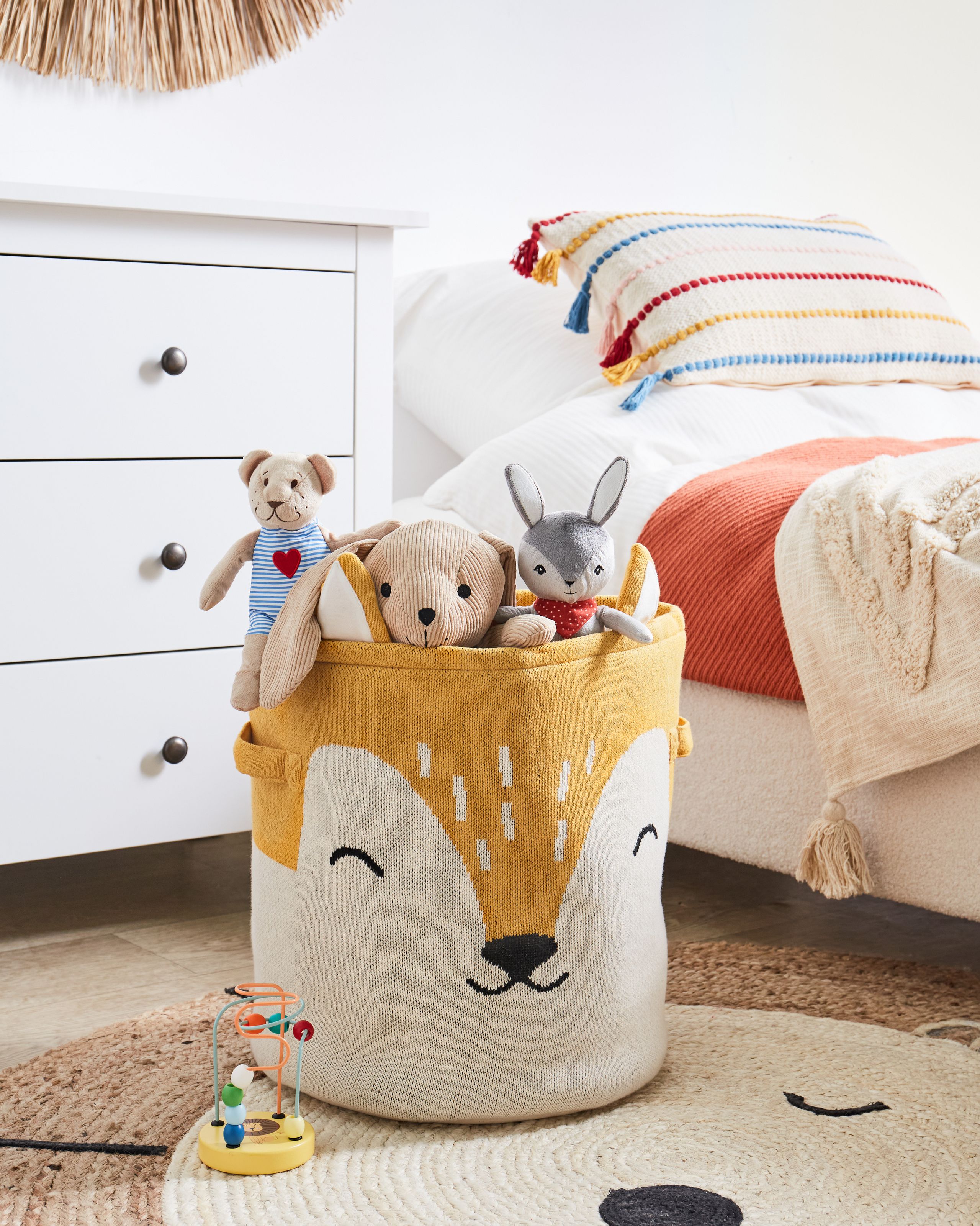 Lelukori kettukuvalla. Lisää sisustukseen ripaus leikkisyyttä ihastuttavalla kettuaiheisella lelukorillamme. Kestävästä puuvillakankaasta valmistettu kori on ihanteellinen lelujen säilyttämiseen, ja helppo siirtää paikasta toiseen kahvojen ansiosta. Kannusta lasta leikkimään ja oppimaan samalla kun pidät huoneen siistinä tämän monipuolisen säilytysratkaisun avulla.