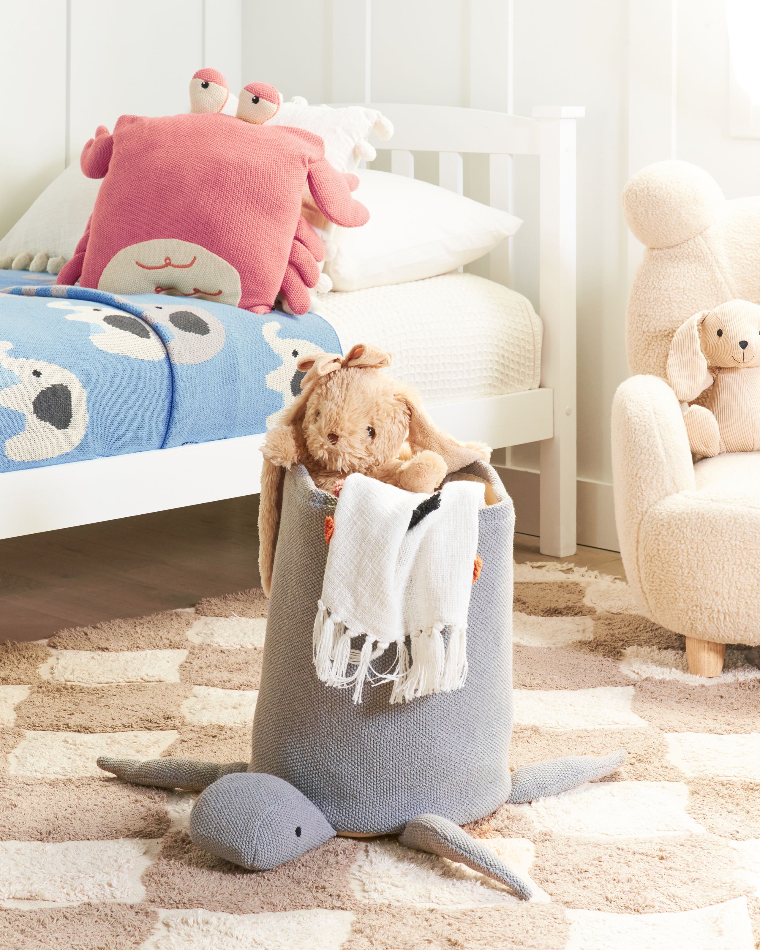 Neulottu kilpikonnan muotoinen lelukori. Sisusta lastenhuone tällä ihastuttavalla kilpikonnan muotoisella säilytyskorilla. Puuvillasta valmistettu kori on hauska ja toimiva lisä mihin tahansa lastenhuoneeseen. Sen viehättävä muotoilu tekee siivoamisesta miellyttävämpää ja auttaa lapsia pitämään lelut, kirjat sekä muut tavarat järjestyksessä. Kori tarjoaa melkoisen määrän säilytystilaa, ja mielenkiintoinen muotoilu sopii monenlaisiin sisustuksiin, joten se on ihastuttava tapa pitää lapsesi tila siistinä.