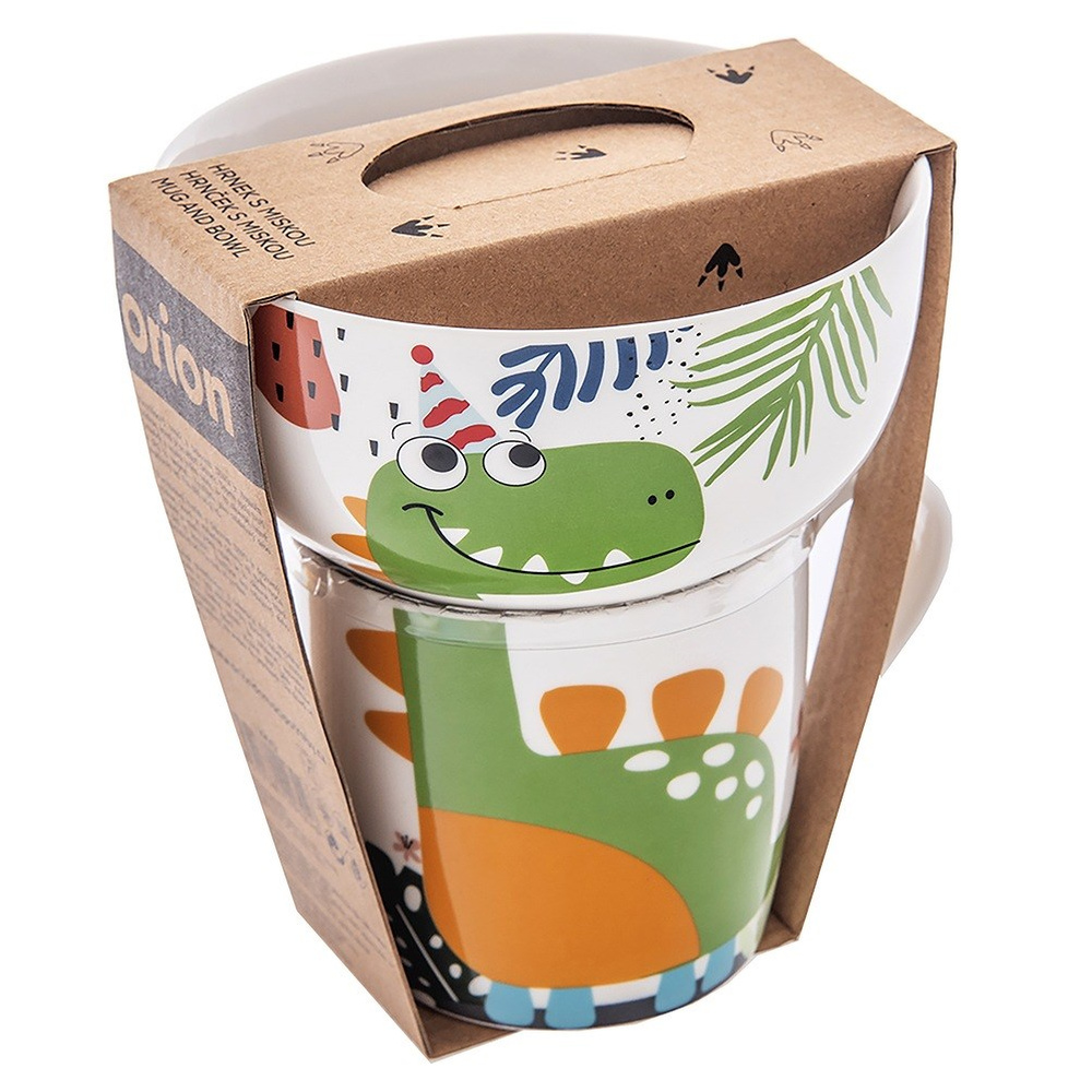 Näyttävä aamiaissetti, jossa on muki ja kulho, jotka on koristeltu viehättävällä dinosaurusaiheella. Tämä setti on käytännöllinen ratkaisu niille, jotka arvostavat toimivia ja esteettisesti miellyttäviä keittiötarvikkeita. Se sopii täydellisesti sekä lapsille että aikuisille. Täydellinen lahjaidea rakkaille. Alkuperäinen tuote tšekkiläiseltä Orion-tuotemerkiltä. Valmistettu eurooppalaisten standardien mukaisesti.