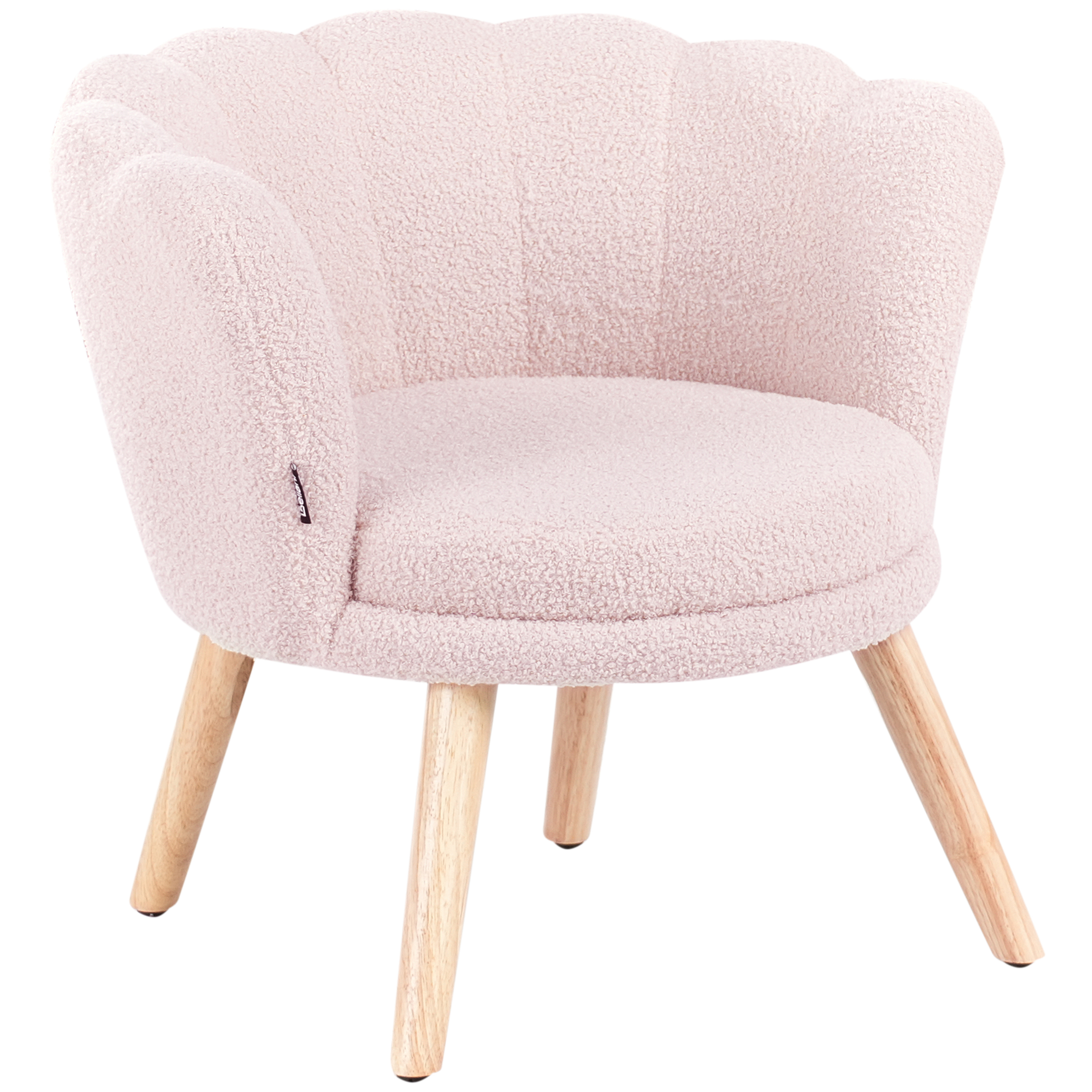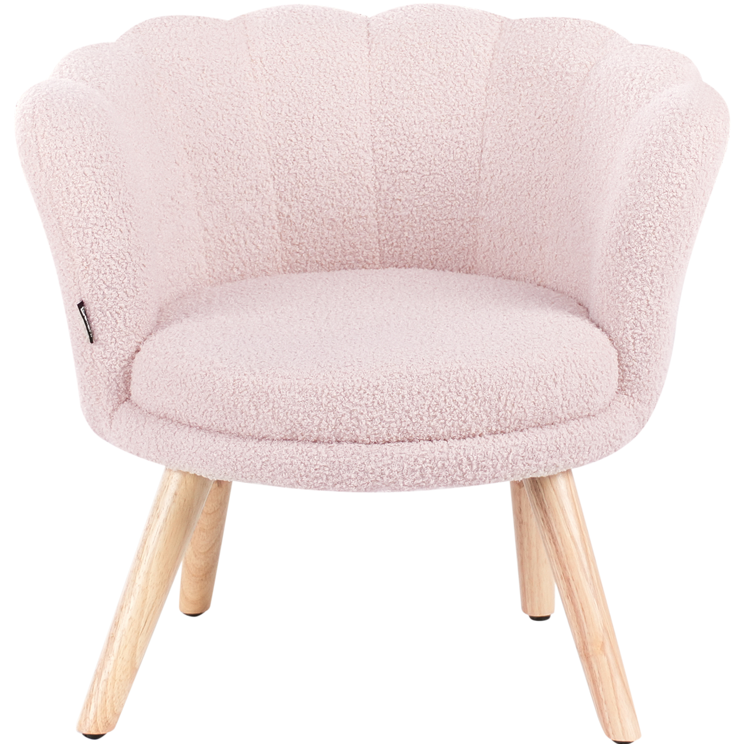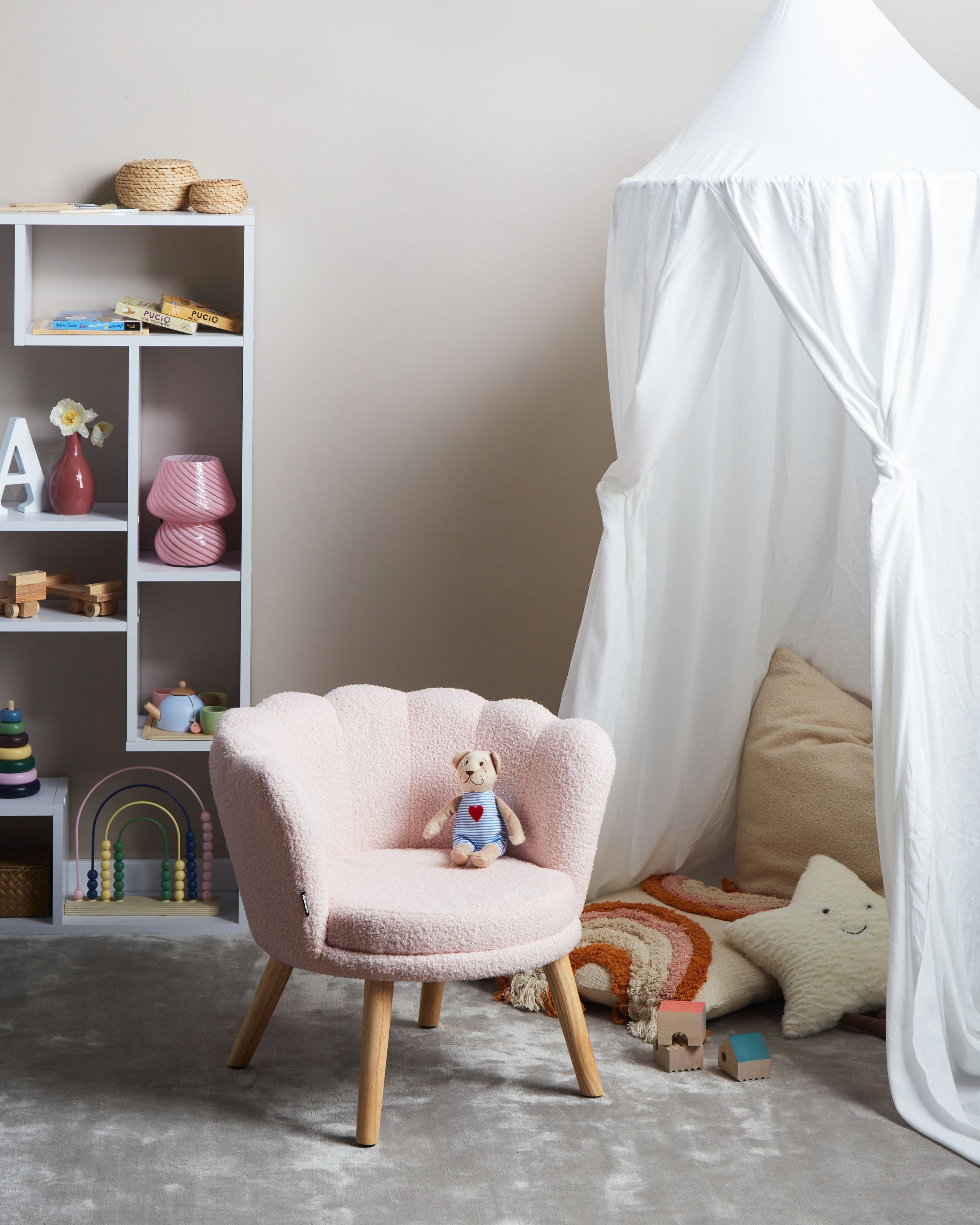 Skandinaavinen lasten nojatuoli simpukkaselkänojalla. Tämä söpö ja tyylikäs pastellipinkki nojatuoli on täydellinen aksentti lastenhuoneeseen. Siinä on viehättävä simpukan muotoinen selkänoja ja pehmeä bukleekangasverhoilu, jotka tuovat mukavuutta ja hauskuutta niin leikkitiloihin kuin lastenhuoneisiinkin. Tukevat kumipuujalat takaavat vakauden, kun taas pyöristetty istuin tarjoaa mukavan paikan lukemiseen, pehmolelujen paijaamiseen tai haaveiluun.