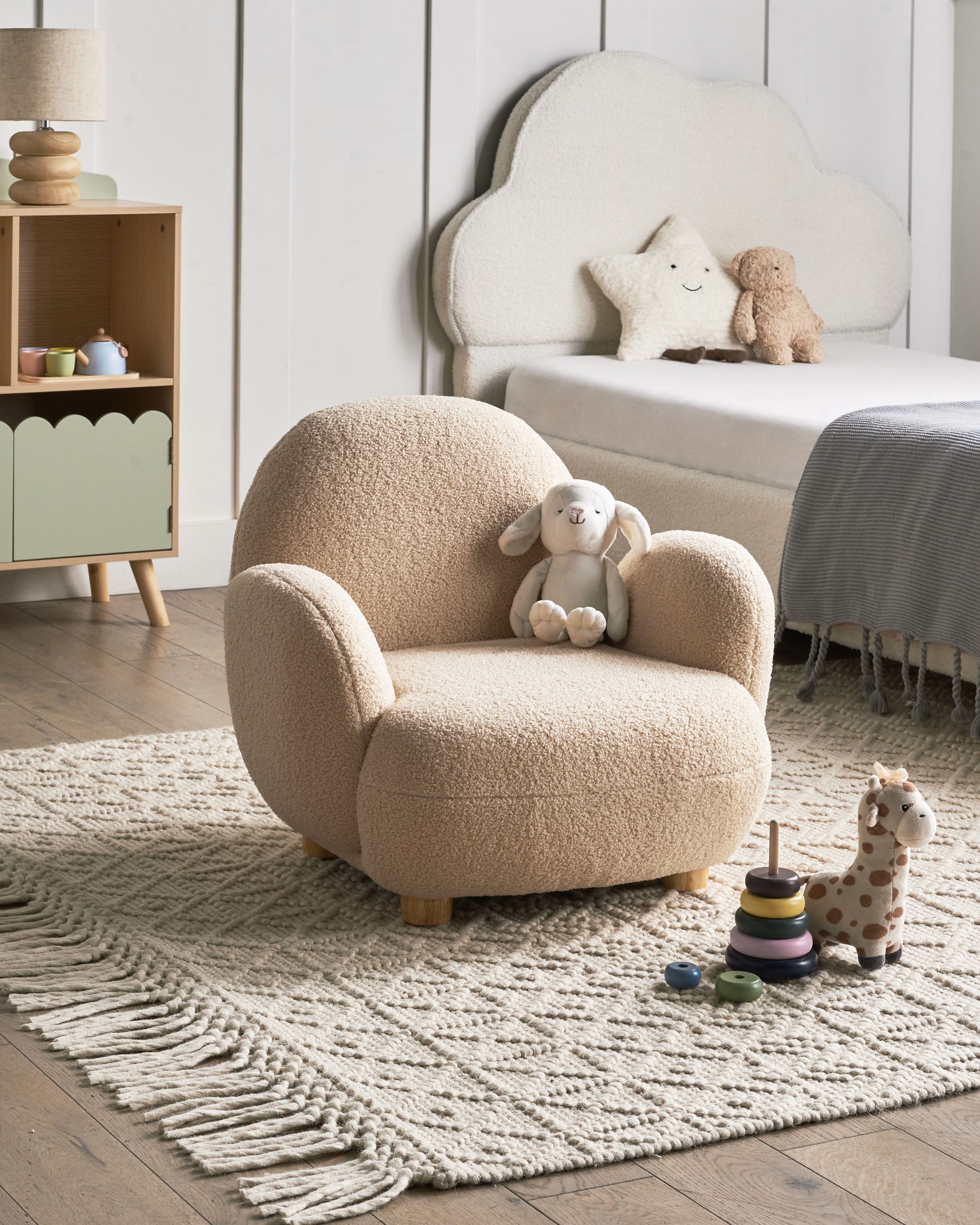 Skandinaavinen pörröinen lasten nojatuoli. Tämä tyylikäs ja viihtyisä lasten nojatuoli on täydellinen lisä jokaisen pienokaisen tilaan. Klassinen muoto ja pehmeä beige bukleeverhoilu sulautuvat kauniisti moniin sisustuksiin. Tukevat kumipuujalat takaavat vakauden, ja tuolin yleisilme lisää lämmintä ja kutsuvaa tunnelmaa. Se sopii erinomaisesti lukemiseen ja rentoutumiseen.