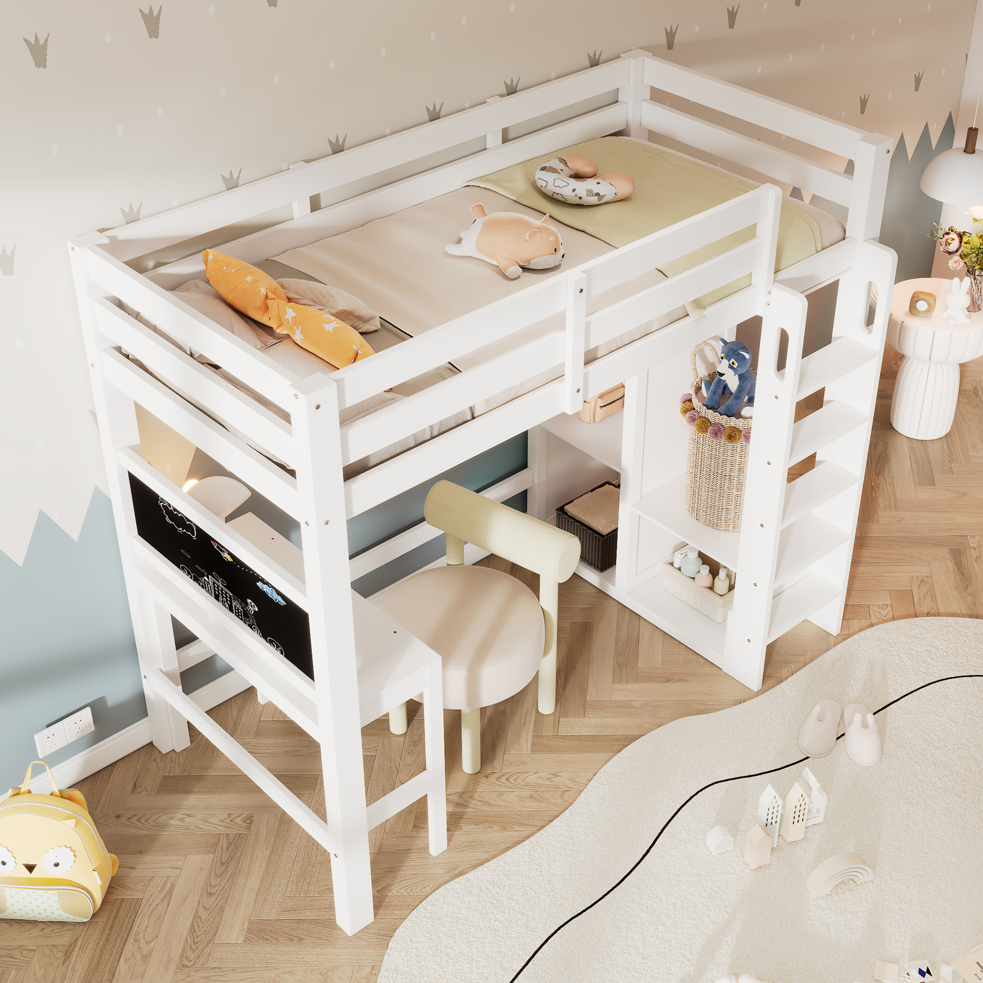 Ainutlaatuinen muotoilu Parvisänky työpöydällä, mustalla kirjoitustaululla ja avovaatekaapilla