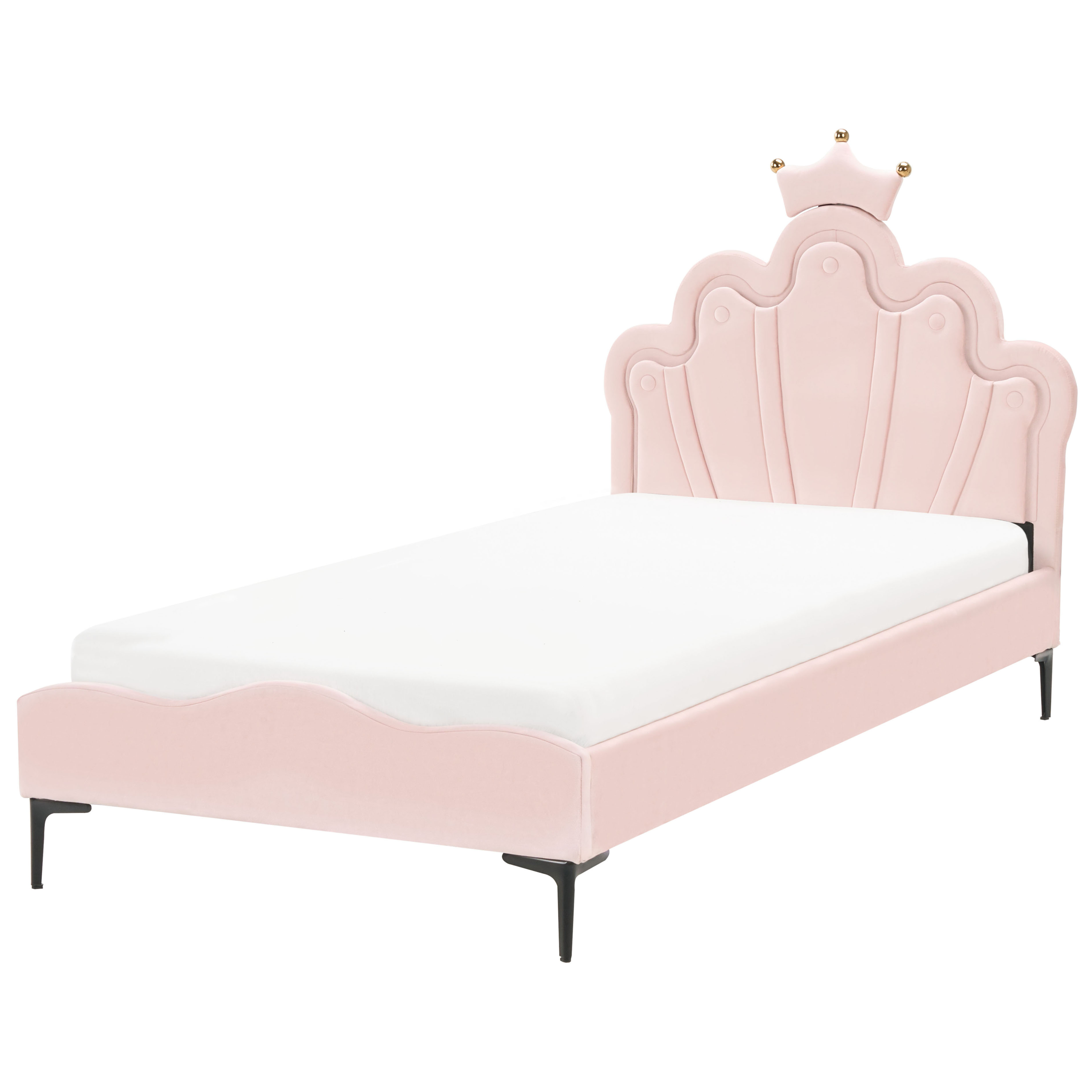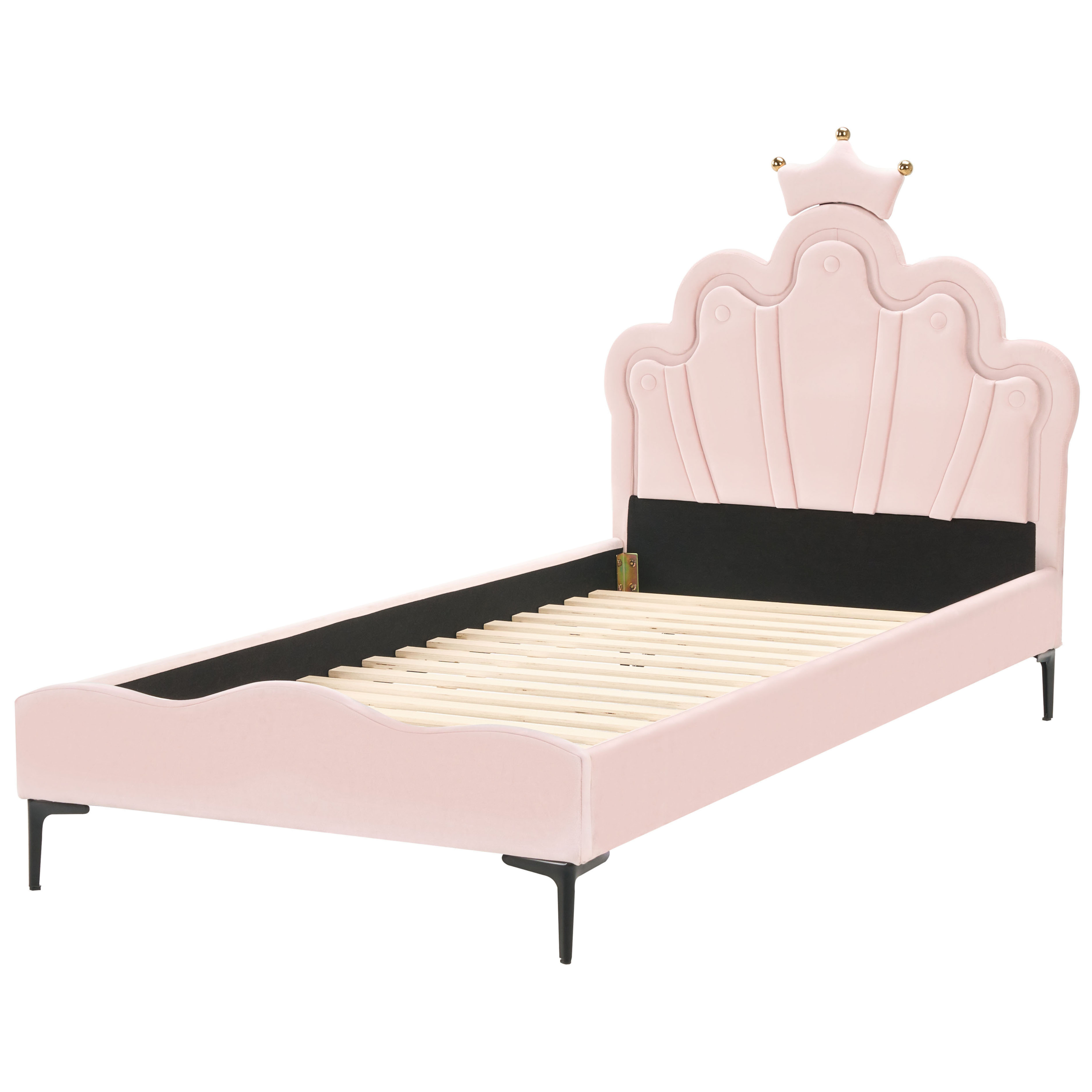 Tyylikäs sängynrunko LED-valoilla. Anna lapsesi tuntea olonsa prinsessaksi tämän lumoavan yhden hengen sängyn avulla. Kuninkaallisessa, kruununmuotoisessa sängynpäädyssä on sisäänrakennettu LED-valaistus, joka luo taianomaisen tunnelman nukkumaan mennessä. Pehmeä vaaleanpunainen samettiverhoilu tuo sänkyyn ripauksen ylellisyyttä, kun taas tukevat mustat metallijalat takaavat pitkäaikaisen kestävyyden. Tämä sänky on täydellinen yhdistelmä eleganssia sekä käytännöllisyyttä, muuttaen minkä tahansa lastenhuoneen unenomaiseksi lepopaikaksi.