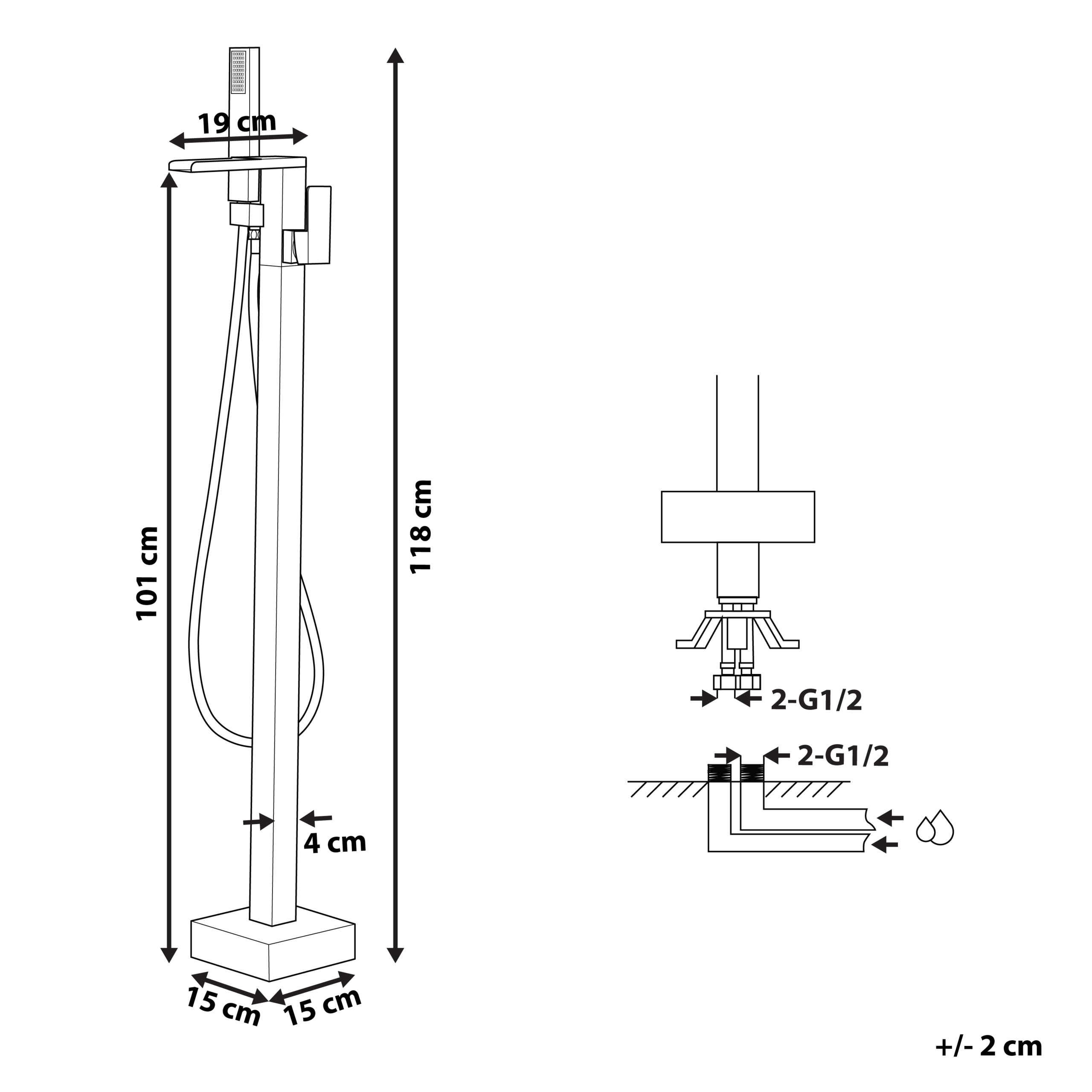 Hintaan sisältyy: 1 x Vapaasti seisovan kylpyammeen hana, 1 x Käsisuihku letkulla, 1 x Asennustarvikkeet