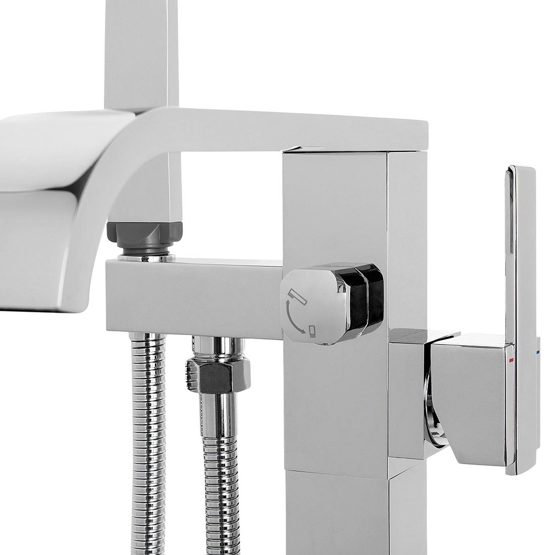 Lattiahana ja käsisuihku vapaasti seisovaan ammeeseen. Tämä vapaasti seisova lattiahana on täydellinen yhdistelmä käytännöllisyyttä ja tyyliä. Elegantin ja särmikkään muotoilunsa ansiosta se täydentää mitä tahansa nykyaikaista kylpyhuonetta, ja kaksikerroksinen kromipinnoite takaa kestävyyden sekä vaivattoman ylläpidon. Käsisuihku on suunniteltu tehokkuuteen ja toimivuuteen, taaten tarkan lämpötilan ja vedenpaineen.