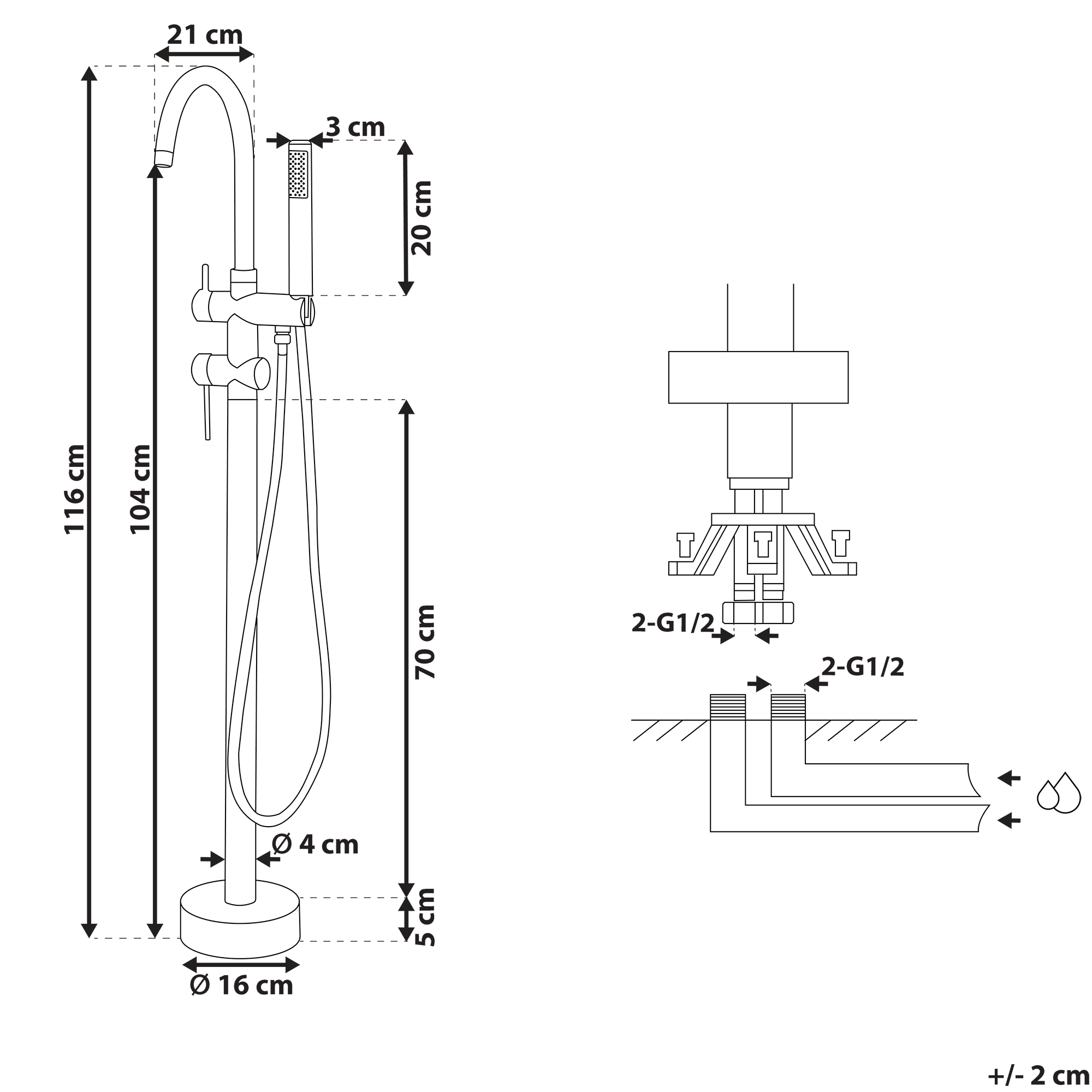 Hintaan sisältyy: 1 x Vapaasti seisovan kylpyammeen hana, 1 x Käsisuihku letkulla, 1 x Asennustarvikkeet