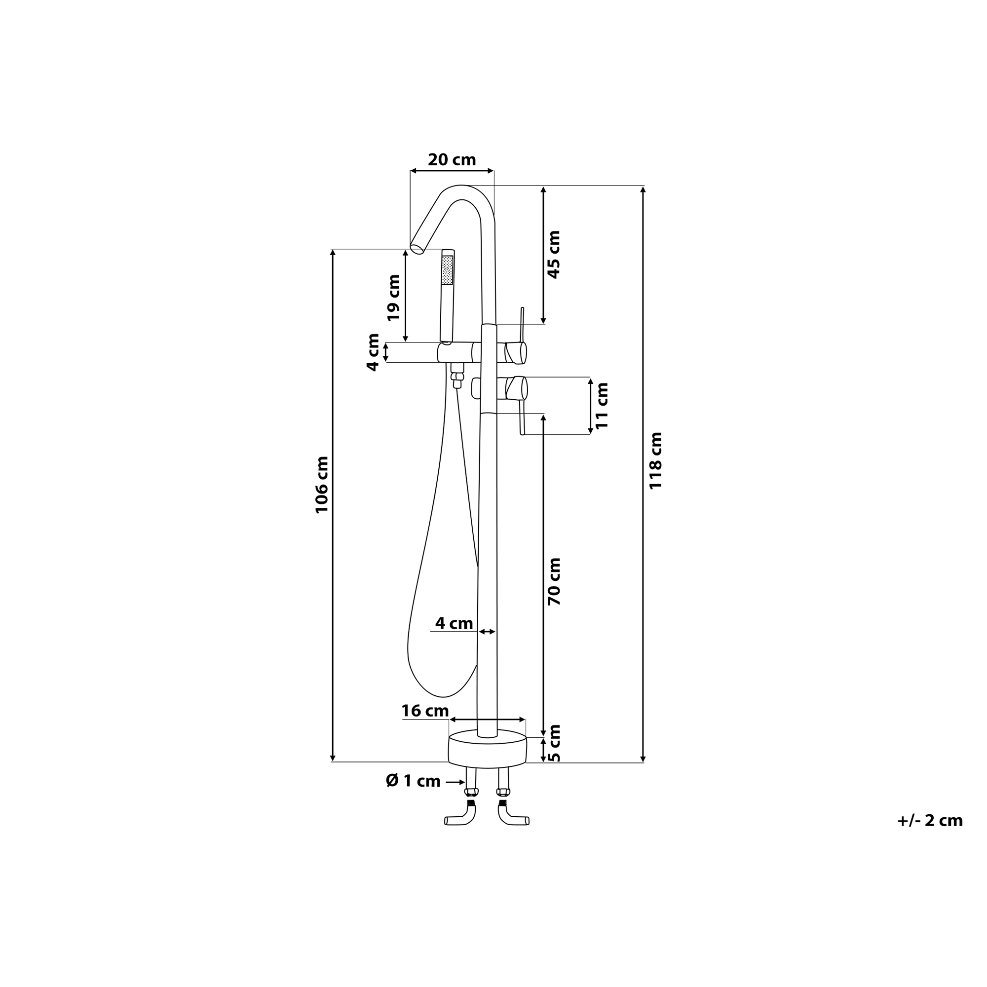 Hintaan sisältyy: 1 x Vapaasti seisovan kylpyammeen hana, 1 x Käsisuihku letkulla, 1 x Asennustarvikkeet