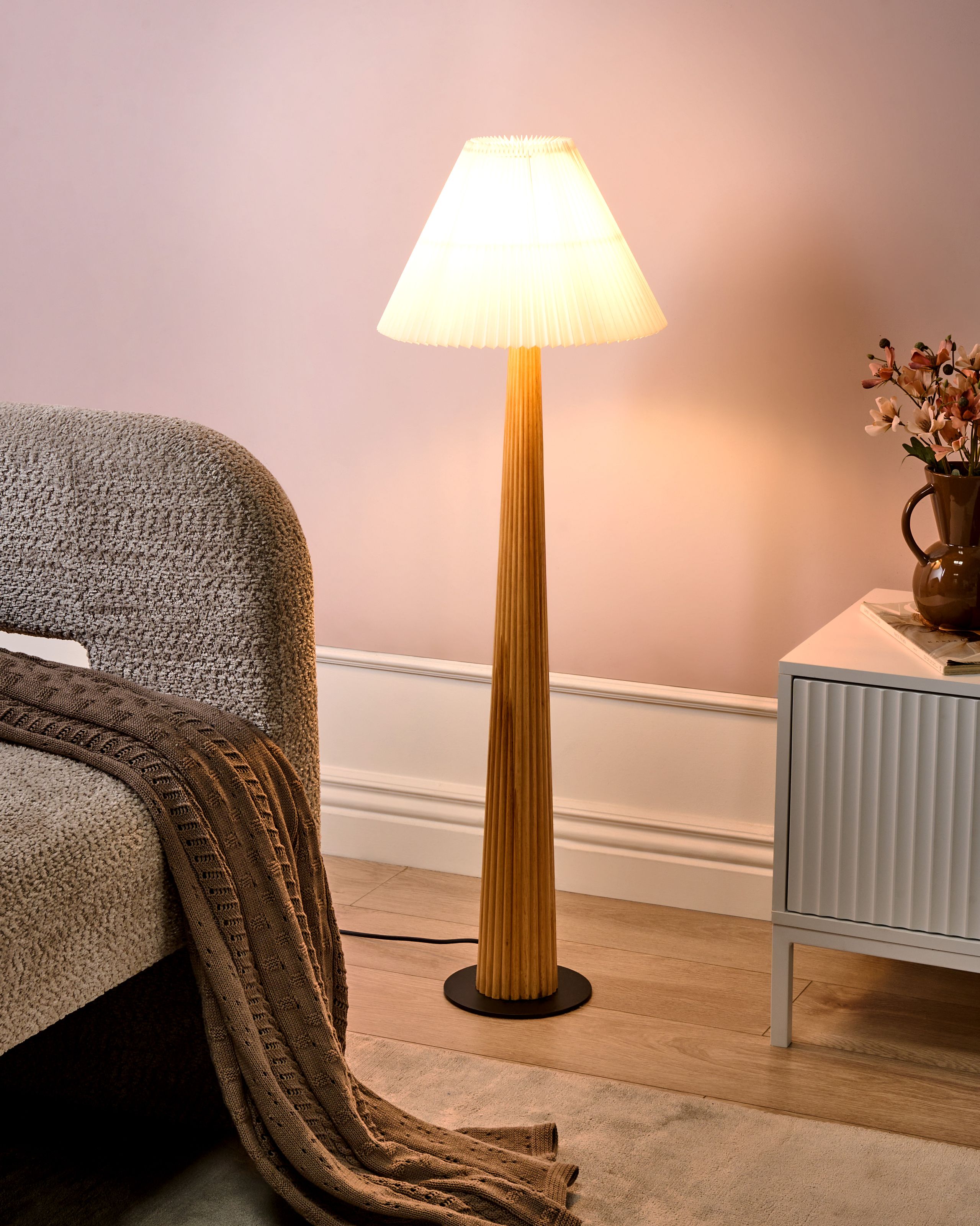 Industriaalinen laskostettu lattialamppu. Tässä lattiavalaisimessa yhdistyvät kumipuusta valmistettu jalka ja kangasvarjostin, mikä luo puhtaan, teollisuusvaikutteisen ilmeen. Sen siro rakenne ja luonnollinen puuviimeistely tuovat sisutukseen lämpöä ja tasapainoa. Valkoinen kangasvarjostin levittää valon pehmeästi, luoden rauhallisen ja rentouttavan tunnelman. Täydellinen sekä olohuoneeseen että makuuhuoneeseen, korostaen tiloja, joissa arvostetaan mukavuutta ja rentoa ilmapiiriä.