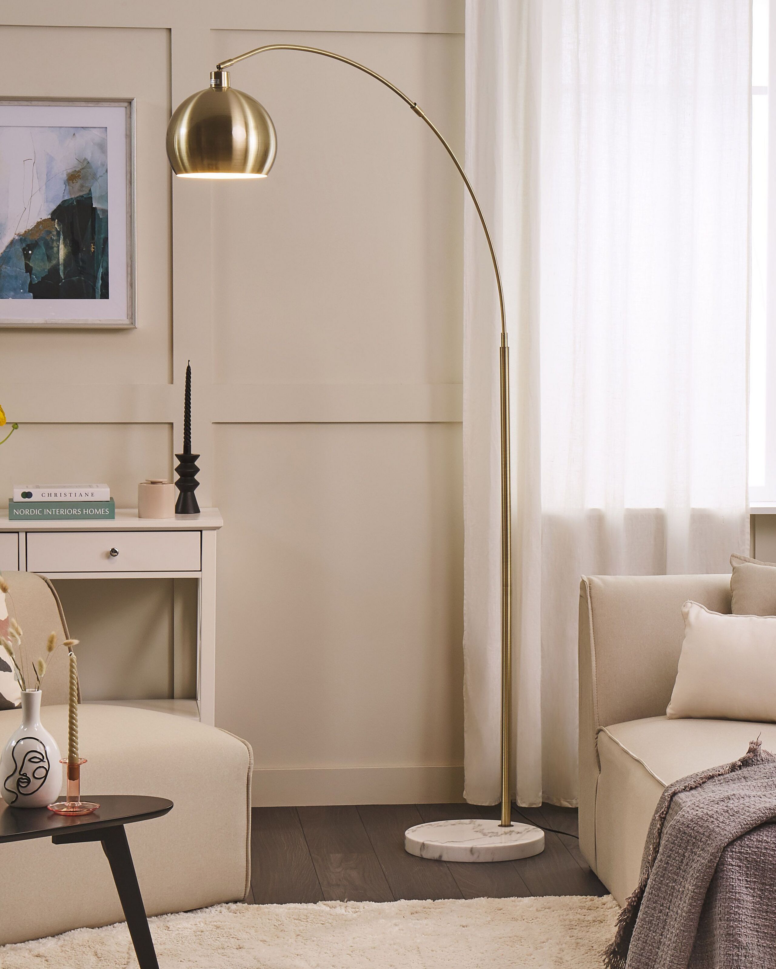 Moderni kaarivalaisin marmorijalustalla. Korkea lattiavalaisin kaarevalla jalalla ja upealla valolla on loistava makuu-, olo- tai ruokahuoneen valaisimeksi. Jalusta on valmistettu marmorista ja jalka metallista. Kiiltävä kuparinvärinen viimeistely antaa lampulle tyylikkään ilmeen. Lampunvarjostin on säädettävissä haluamaasi asentoon.