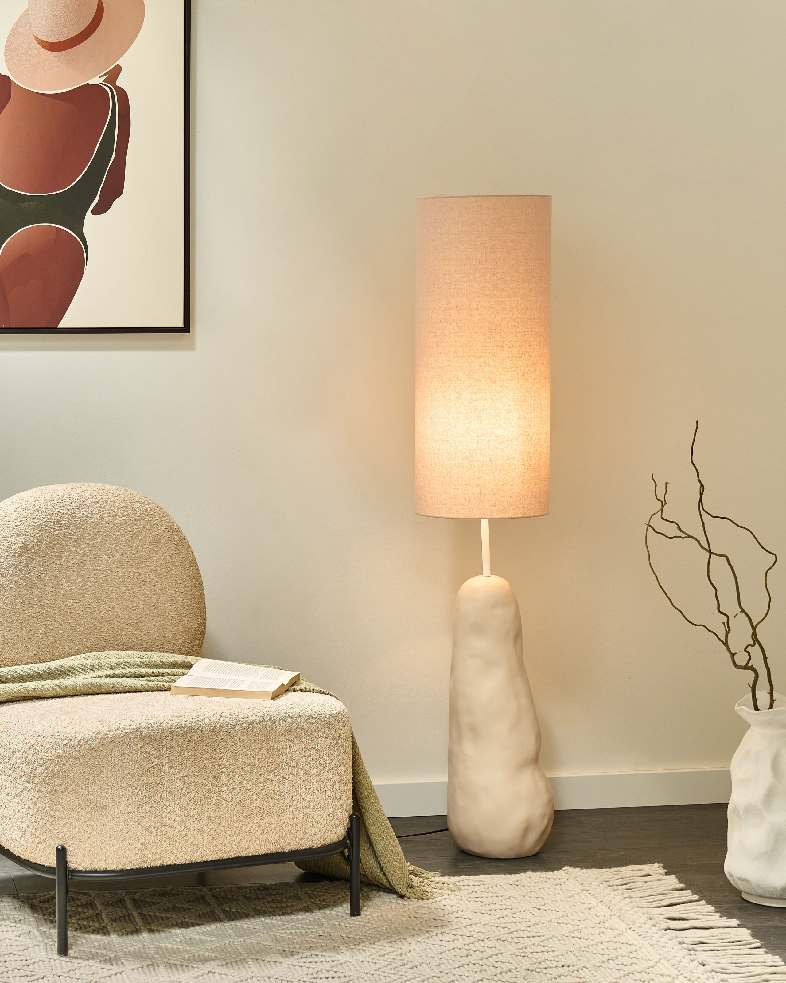 Korkea lattiavalaisin kangasvarjostimella. Tämä luonnonmukainen lattiavalaisin tuo taiteellista tunnelmaa mihin tahansa asuintilaan. Keraaminen veistoksellinen jalusta antaa valaisimelle ainutlaatuisen luonteen, joka istuu vaivattomasti tyylikkääseen, nykyaikaiseen kotiin. Korkeaa kangasvarjostinta voi kallistaa sivulle, jolloin voit säätää valoa juuri sinne, missä sitä tarvitset. Valaisin sopii kaikille, jotka arvostavat hienovaraista taiteellisuutta yhdistettynä käytännölliseen muotoiluun.