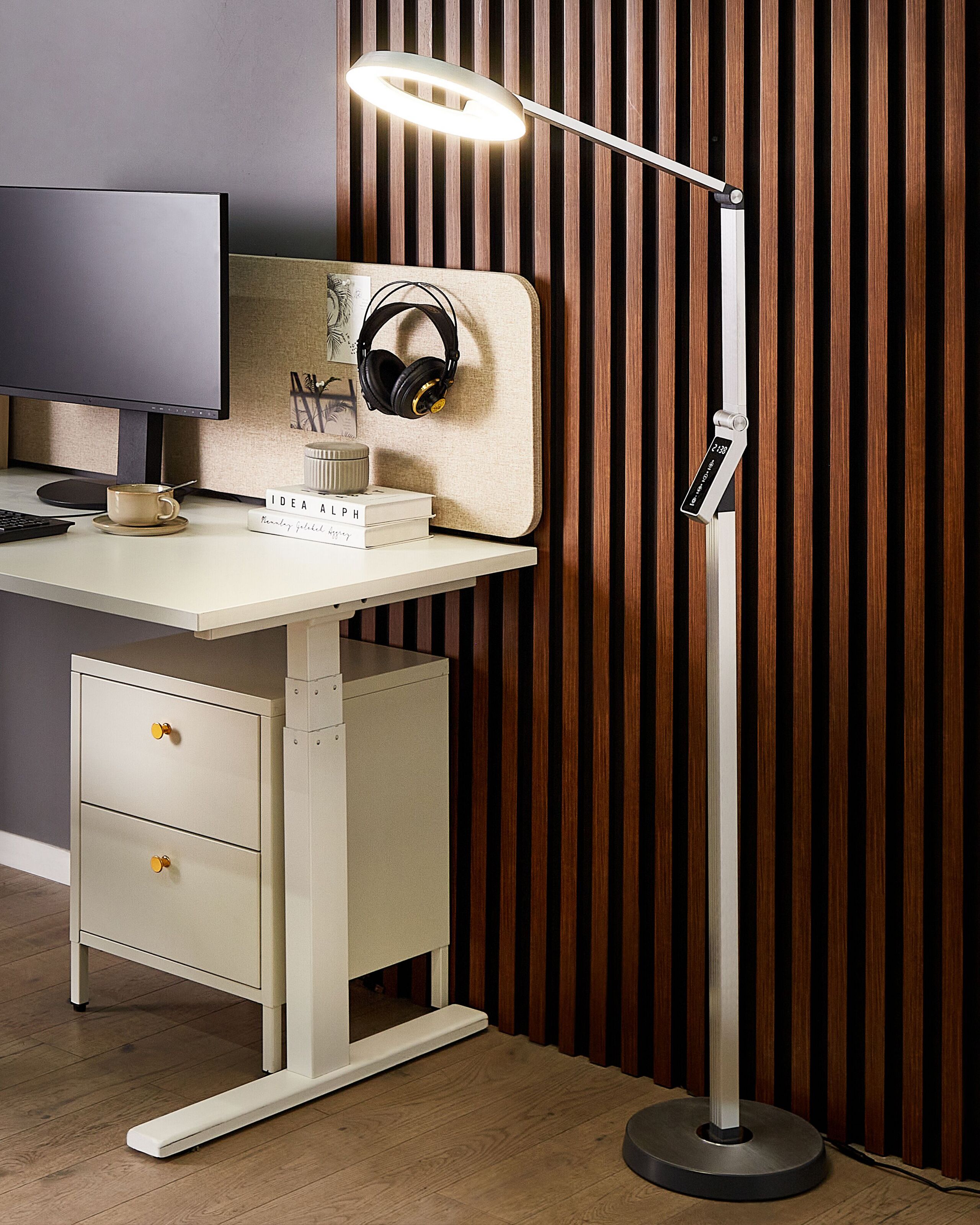 Moderni LED-valaisin himmentimellä ja LCD-näytöllä. Varusta työtilasi tällä LED-lattiavalaisimella valaistaksesi huoneen vahvalla ja miellyttävällä valolla. Muovista ja metallista valmistettu valaisin on erittäin pitkäikäinen ja helppohoitoinen. Kestävyytensä lisäksi siinä on useita käytännöllisiä toimintoja. Säädettävän jalan ja varjostimen avulla voit osoittaa valon juuri sinne, missä sitä tarvitset. Lisäksi jalassa oleva LCD-näyttö mahdollistaa valon himmentämisen sekä sen voimakkuuden ja värilämpötilan säätämisen. Näytössä on myös digitaalinen kello. Valaisin näyttää erityisen hyvältä moderneissa tai industriaalisissa sisustuksissa.