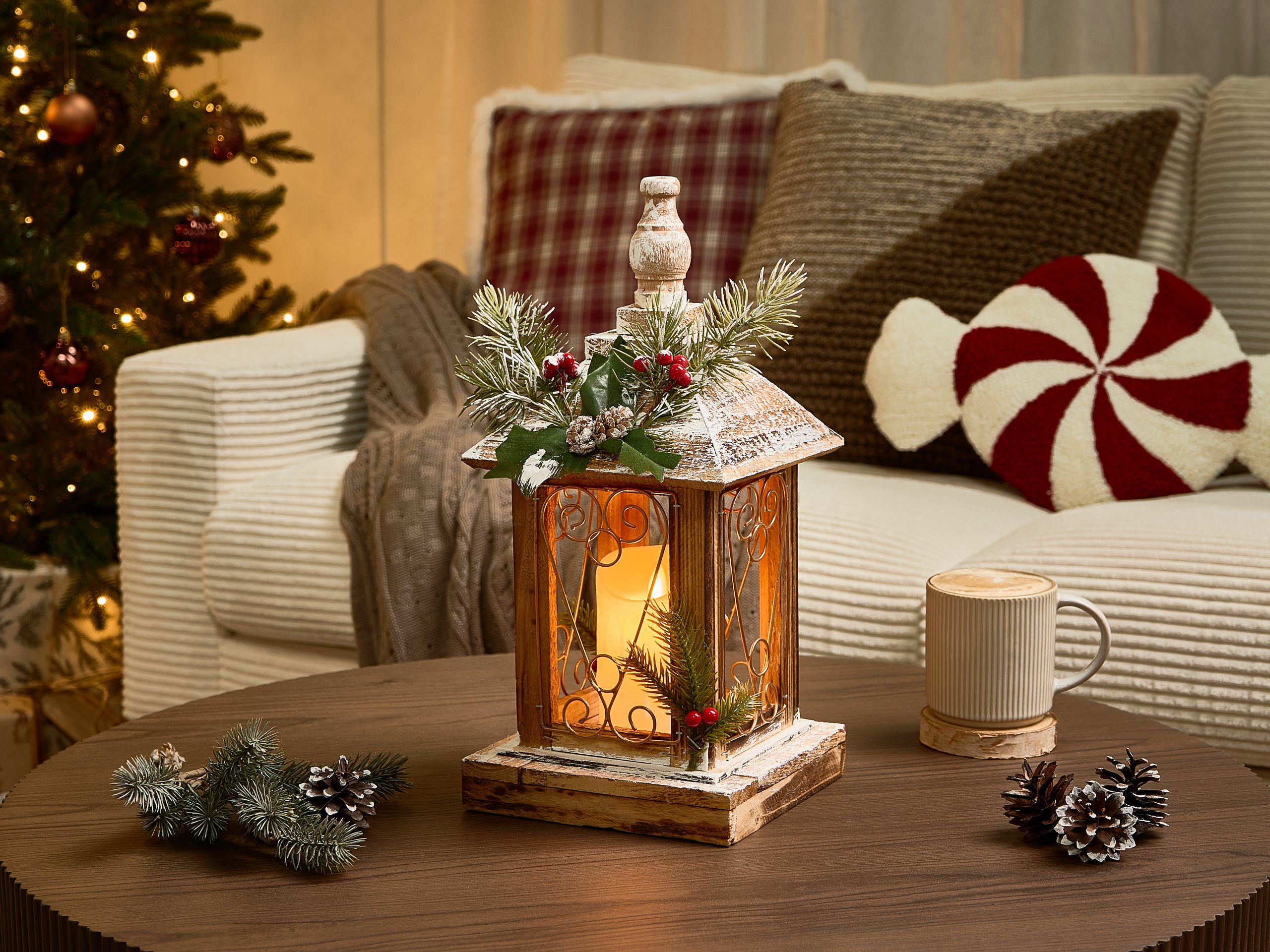 Rustiikkinen joulukoriste LED-kynttilällä. Luo joulukoristeluun lämmin tunnelma tällä käsintehdyllä koristelyhdyllä. Hurmaavilla tekomarjoilla, -oksilla ja kävyillä koristellun lyhdyn sisällä on lempeästi hehkuva LED-kynttilä, joka tuo tilaan juhlavaa ilmettä. Se on valmistettu patinoituneen näköiseksi viimeistellystä jalokuusesta, minkä ansiosta se yhdistää luonnonviehätyksen ja kestävyyden.