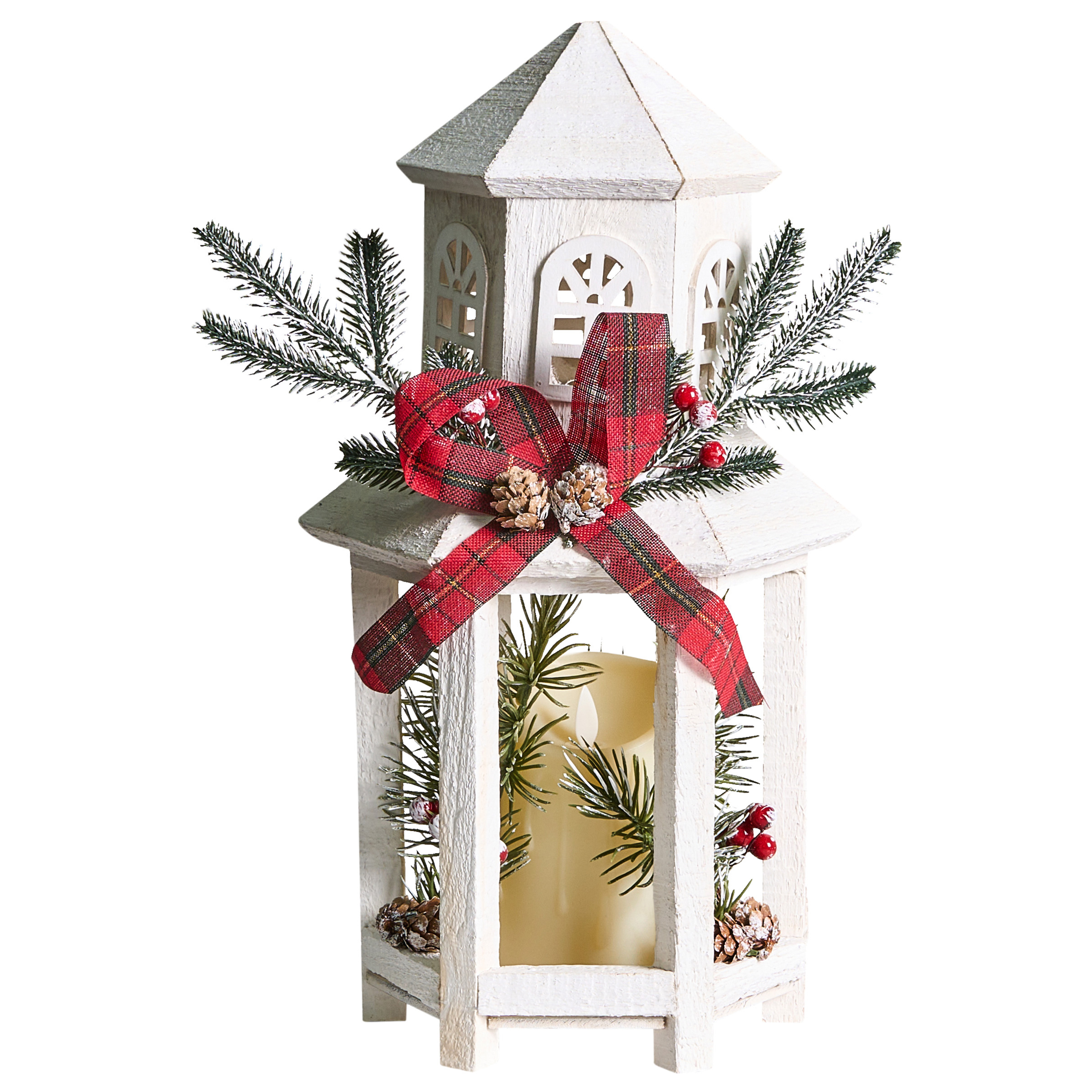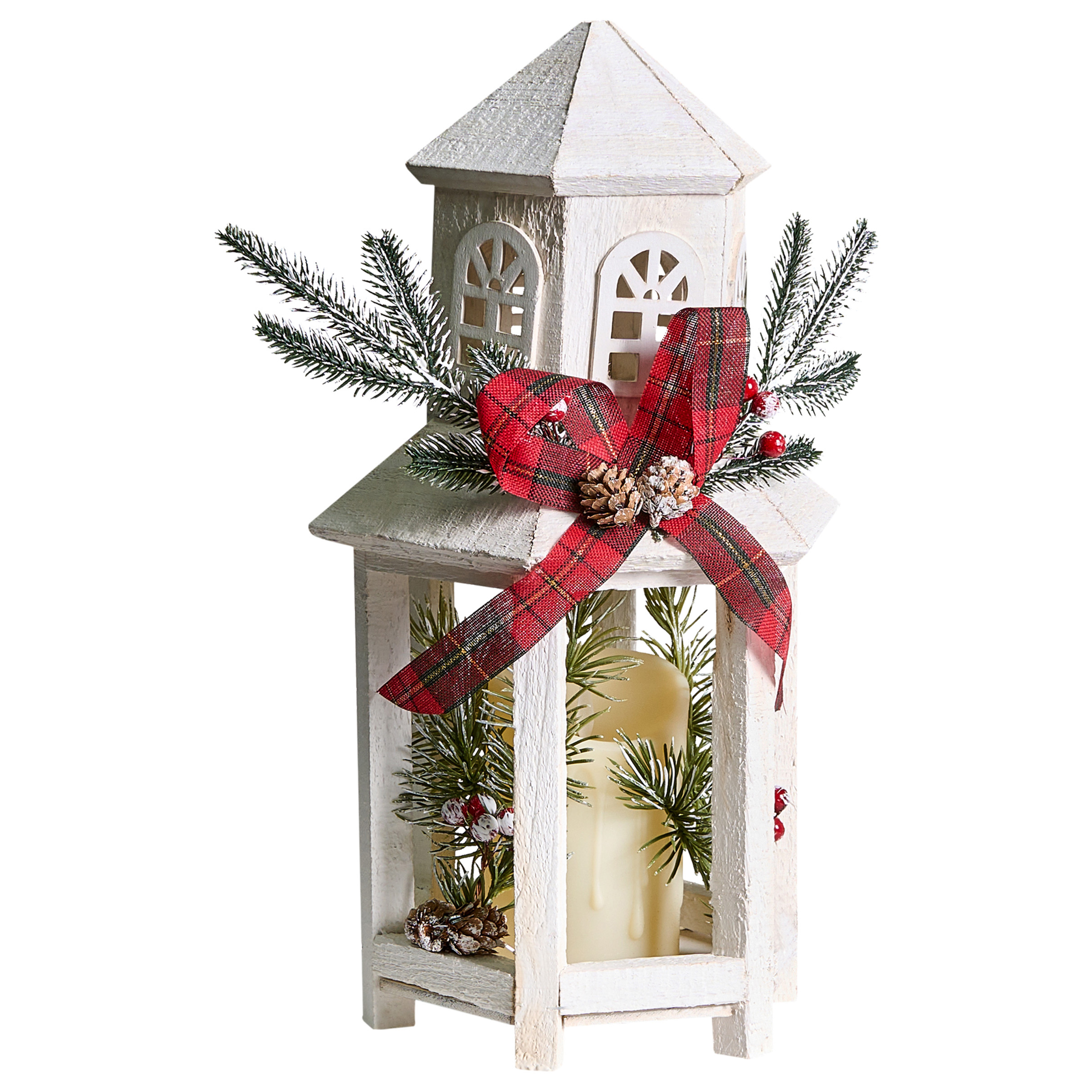 Perinteinen joulukoriste LED-kynttilällä. Nauti joulutunnelmasta tällä käsintehdyllä LED-koristelyhdyllä. Se on valmistettu jalokuusesta ja koristeltu punaisilla tekomarjoilla ja rusetilla, vihreillä teko-oksilla sekä kävyillä, minkä ansiosta se vangitsee kauden olemuksen vaivattomasti. Sisään asetettu LED-kynttilä viimeistelee ilmeen ja tarjoaa lämpimän, pehmeän valon, joka korostaa mitä tahansa senkkiä, pöytää tai hyllyä.