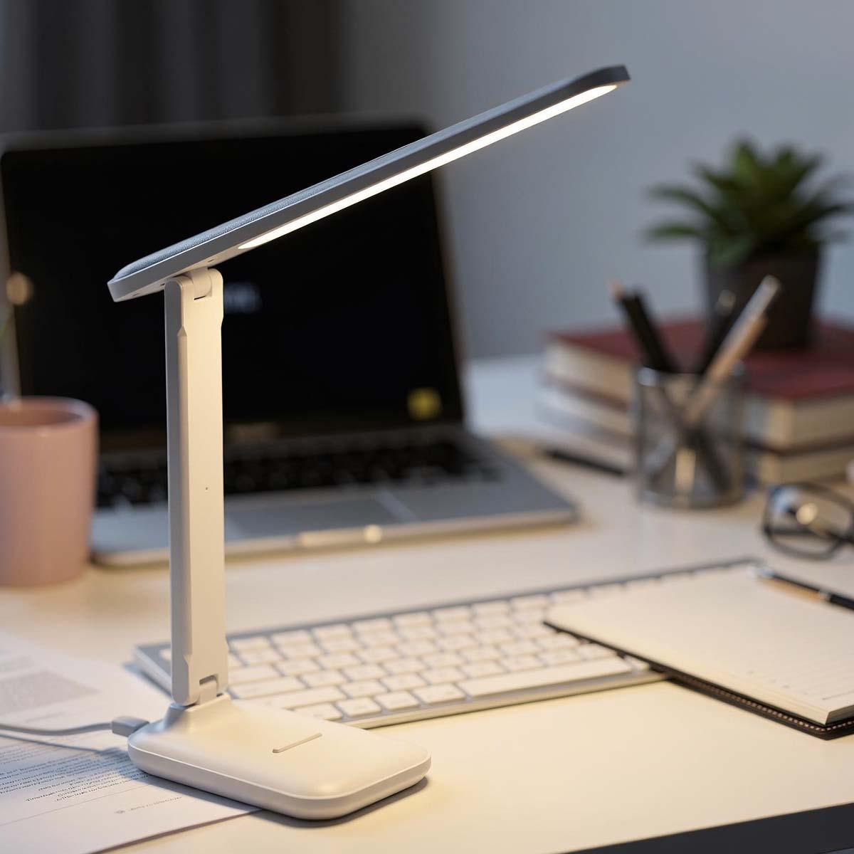 Tämä kokoontaitettava LED-pöytävalaisin tarjoaa pehmeän, tasaisen valaistuksen optimaalista näkömukavuutta varten. Kolmen värilämpötilan ansiosta se voidaan helposti sovittaa lukemiseen, työskentelyyn tai rentoutumiseen. Sen 180° kääntyvän pään avulla voit suunnata valon tarkasti. Se on varustettu sinistä valoa ja välkyntää vähentävällä silmiensuojaustekniikalla, joka vähentää silmien väsymistä.