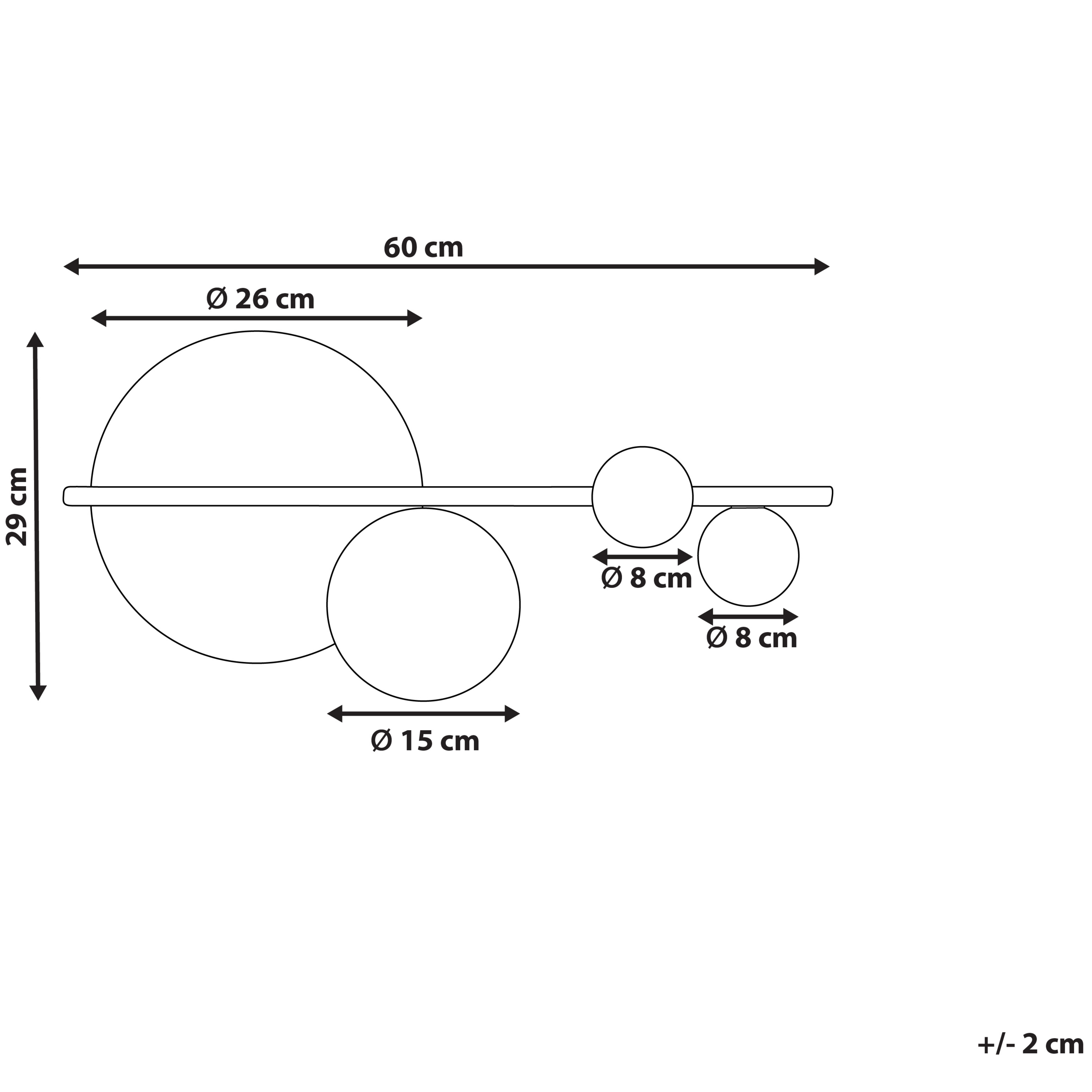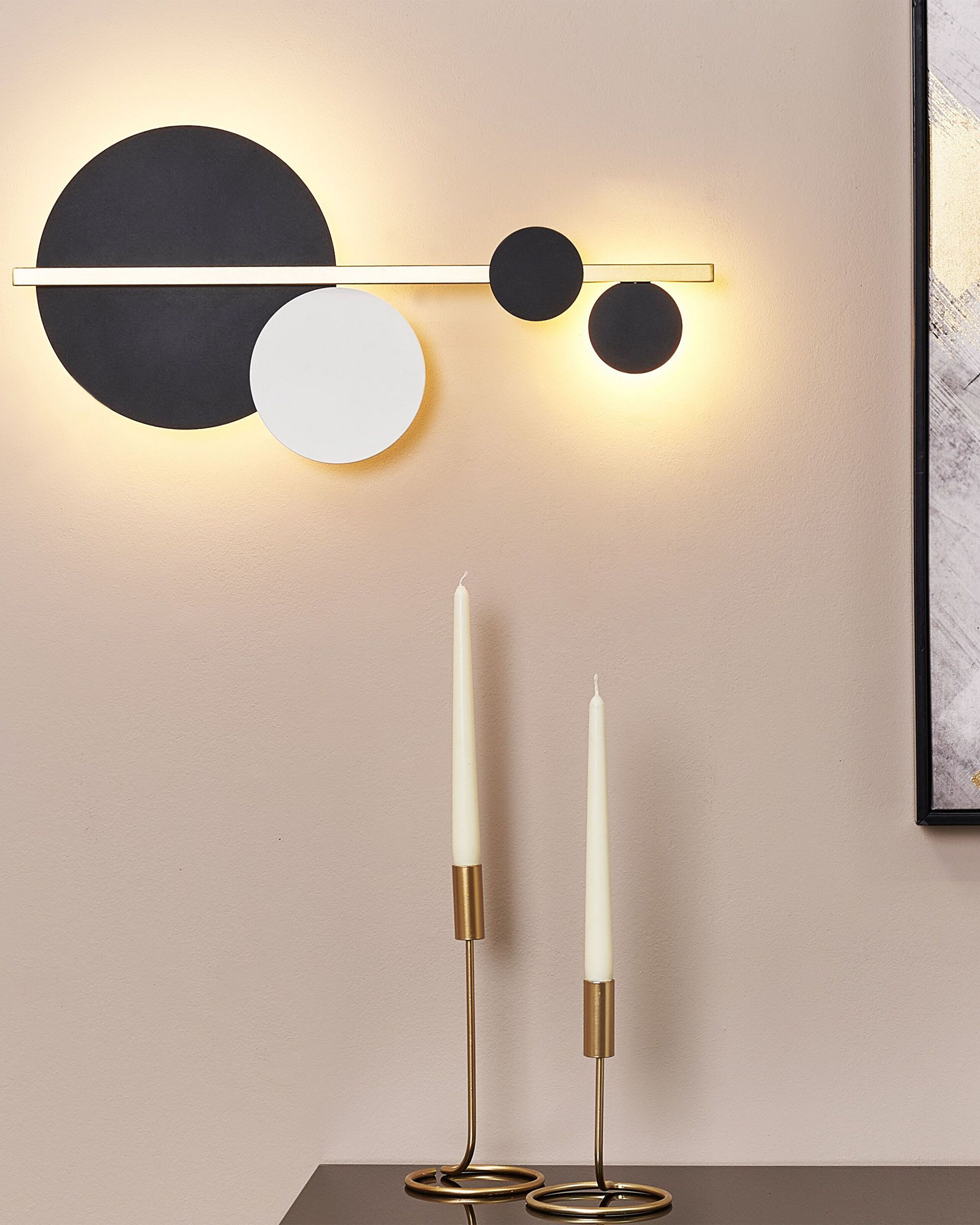 Abstrakti art deco -seinävalaisin. Tämä abstrakti seinävalaisin toimii loistavasti myös tyylikkäänä seinäkoristeena. Sen erikokoiset pyöreät varjostimet kätkevät taakseen integroidut LED-valot, jotka täyttävät tilan kuin tilan lämpimällä ja tunnelmallisella hajavalolla. Varjostimet on kiinnitetty vaakasuorassa olevaan metallitankoon. Sen moderni muotoilu sopii erityisen hyvin etenkin art deco -tyylisiin ja nykyaikaisiin sisustuksiin.