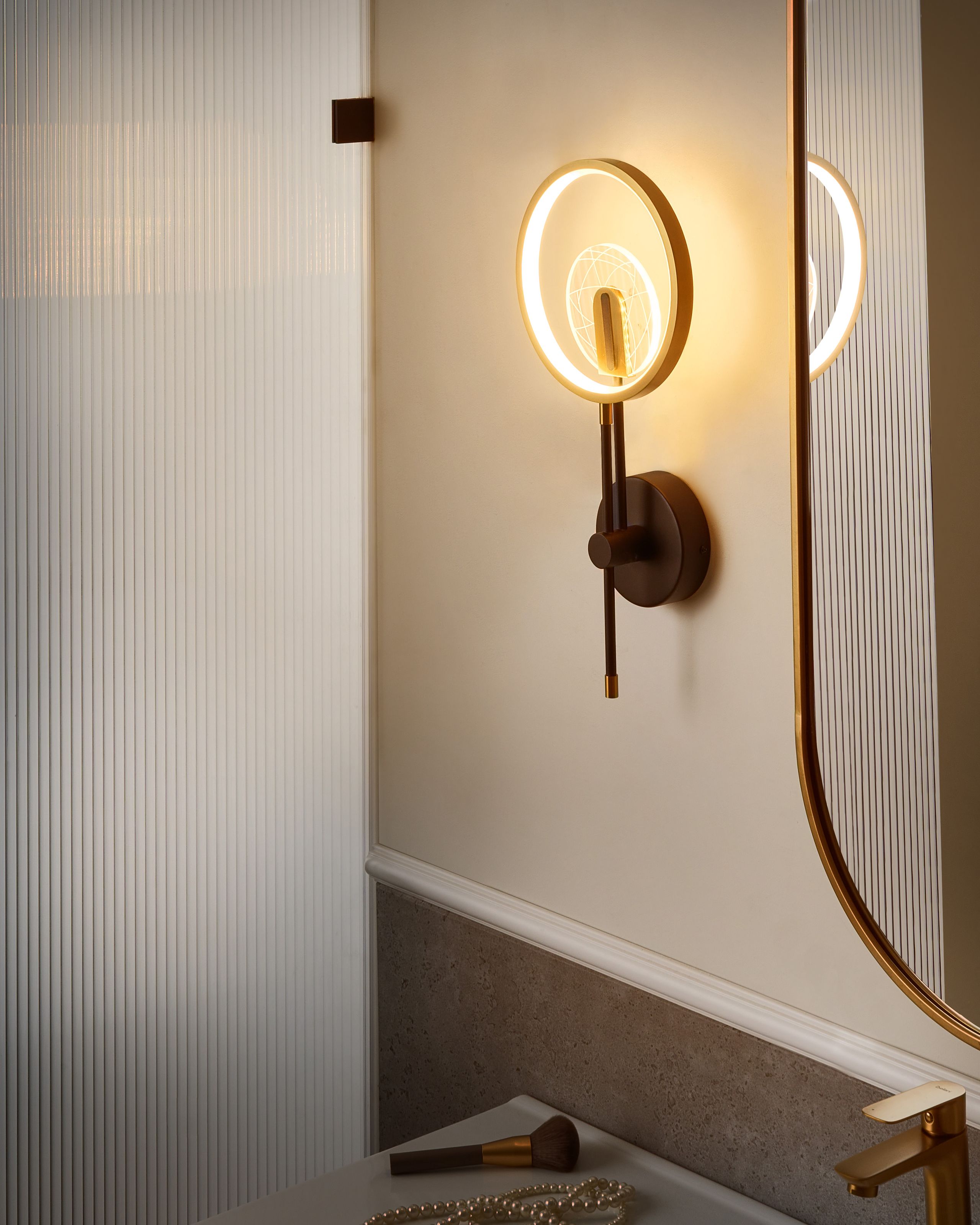 Koristeellinen seinään asennettava LED-valaisin. Tämä tyylikäs LED-seinävalaisin yhdistää minimalistisen muotoilun ja käytännöllisen toiminnallisuuden. Se tuottaa vahvan ja tasaisen valon, joka sopii täydellisesti kylpyhuoneen peilille tai kodin muihin tiloihin. Sisäänrakennettu LED-valo antaa lämpimän ja kutsuvan hehkun, taaten samalla erinomaisen energiatehokkuuden. Jauhemaalatusta alumiinista valmistettua runkoa täydentävät kiiltävät kullansävyiset yksityiskohdat, minkä ansiosta valaisin tuo tilaan ripauksen modernia eleganssia.