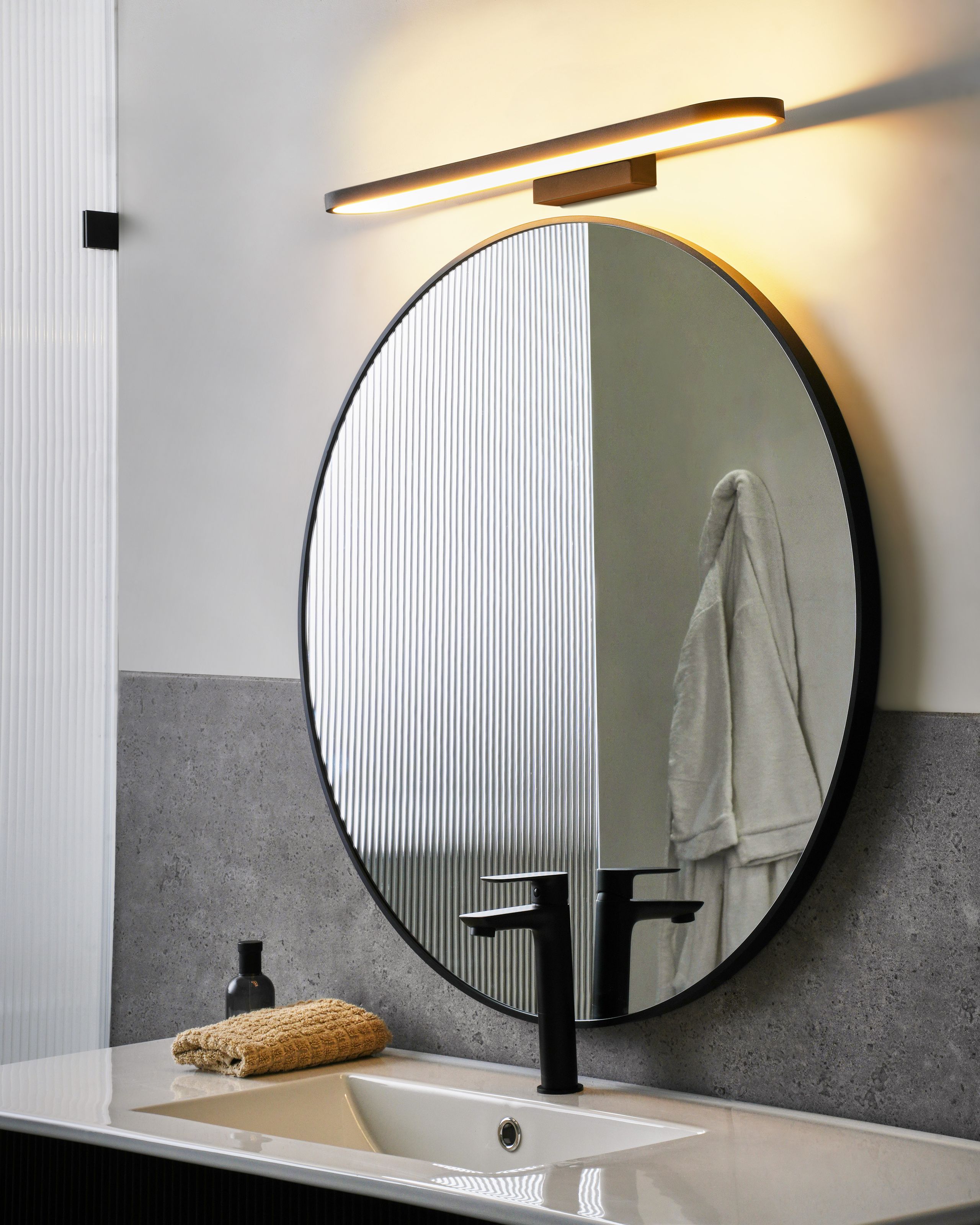 Moderni seinävalaisin taulun tai peilin ylle. Tämä moderni vaakasuora seinävalaisin tarjoaa lempeän, tasaisen hehkun, joka korostaa kauniisti mitä tahansa tilaa. Se on valmistettu kestävästä jauhemaalatusta alumiinin ja raudan sekoituksesta, minkä ansiosta se on pitkäikäinen ja säilyttää tyylikkään, nykyaikaisen ulkonäön. Valaisin sopii erinomaisesti kylpyhuoneen peilin tai olohuoneen taulujen ja valokuvien ylle, tuoden kotiin tyyliä ja käytännöllisyyttä.