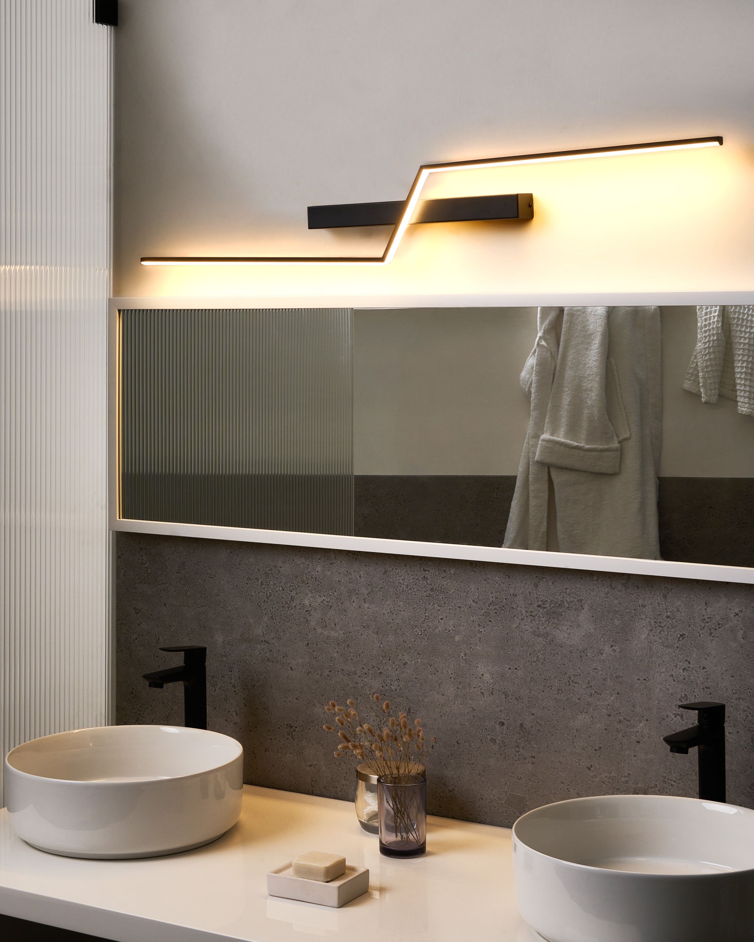Moderni geometrinen seinävalaisin. Tämä nykyaikainen seinävalaisin ainutlaatuisella, kulmikkaalla muotoilulla luo pehmeän ja tasaisen hehkun, joka korostaa mitä tahansa tilaa täydellisesti. Tukevasta jauhemaalatusta alumiinin ja raudan sekoituksesta valmistettu valaisin on rakennettu kestämään ja säilyttämään tyylikkään, modernin ulkonäön. Se sopii erinomaisesti kylpyhuoneen peilin tai olohuoneen taulujen ja valokuvien ylle, kohottaen tilaa tyylillä ja käytännöllisyydellä.