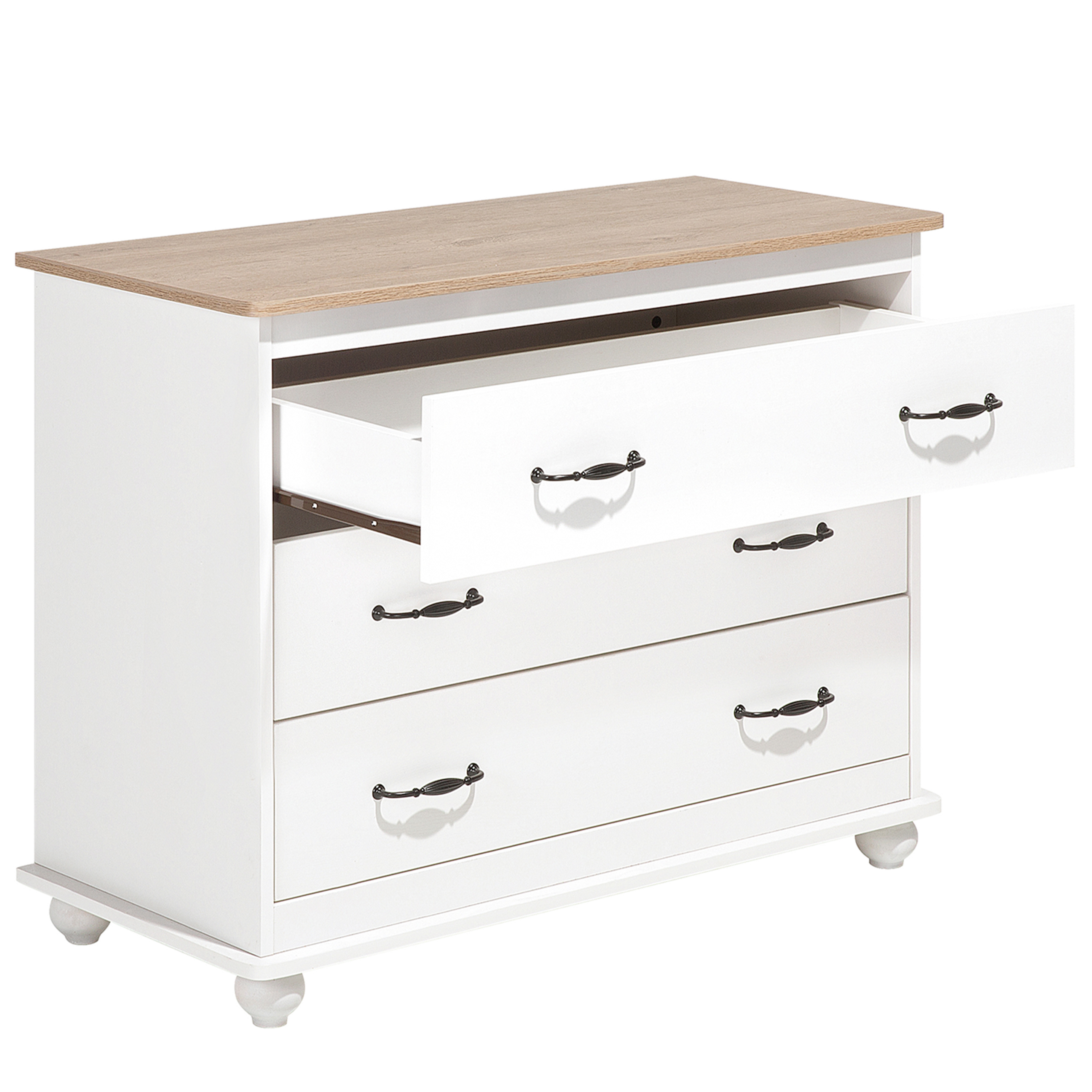 Maalaisromanttinen piironki mustilla vetimillä. Toimivaa ja kaunista - tämän lipaston viehättävä maalaistyyli tyyli on vertaansa vailla. Tukevasta MDF-levystä valmistettu, valkoinen lipasto on monipuolisen käyttötarkoituksen ja yksinkertaisen muotoilun ansiosta täydellinen lisä jokaiseen huoneeseen. Kolme tilavaa laatikkoa tarjoaa runsaasti säilytystilaa.