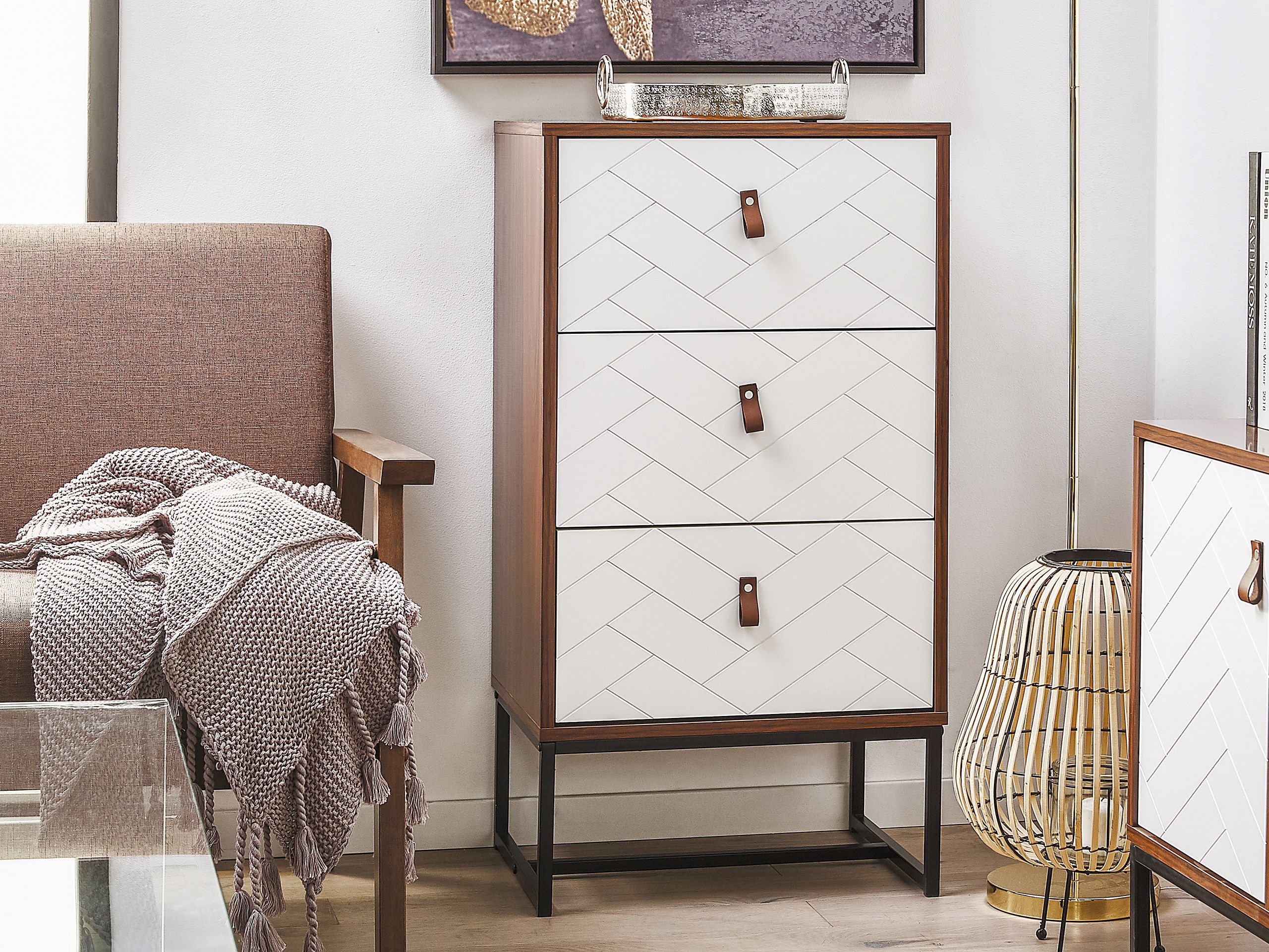 Moderni korkea lipasto. Tämä lipasto on loistava vaihtoehto, jos etsit perinteistä säilytysratkaisua modernilla ilmeellä. Tuote on valmistettu kestävästä MDF-levystä ja tukevista metallisista jaloista. Lipaston kolme laatikkoa tarjoavat runsaasti säilytystilaa. Tyylikkäät yksityiskohdat, kuten keinonahkaiset vetimet, tekevät lipastosta hienostuneen.