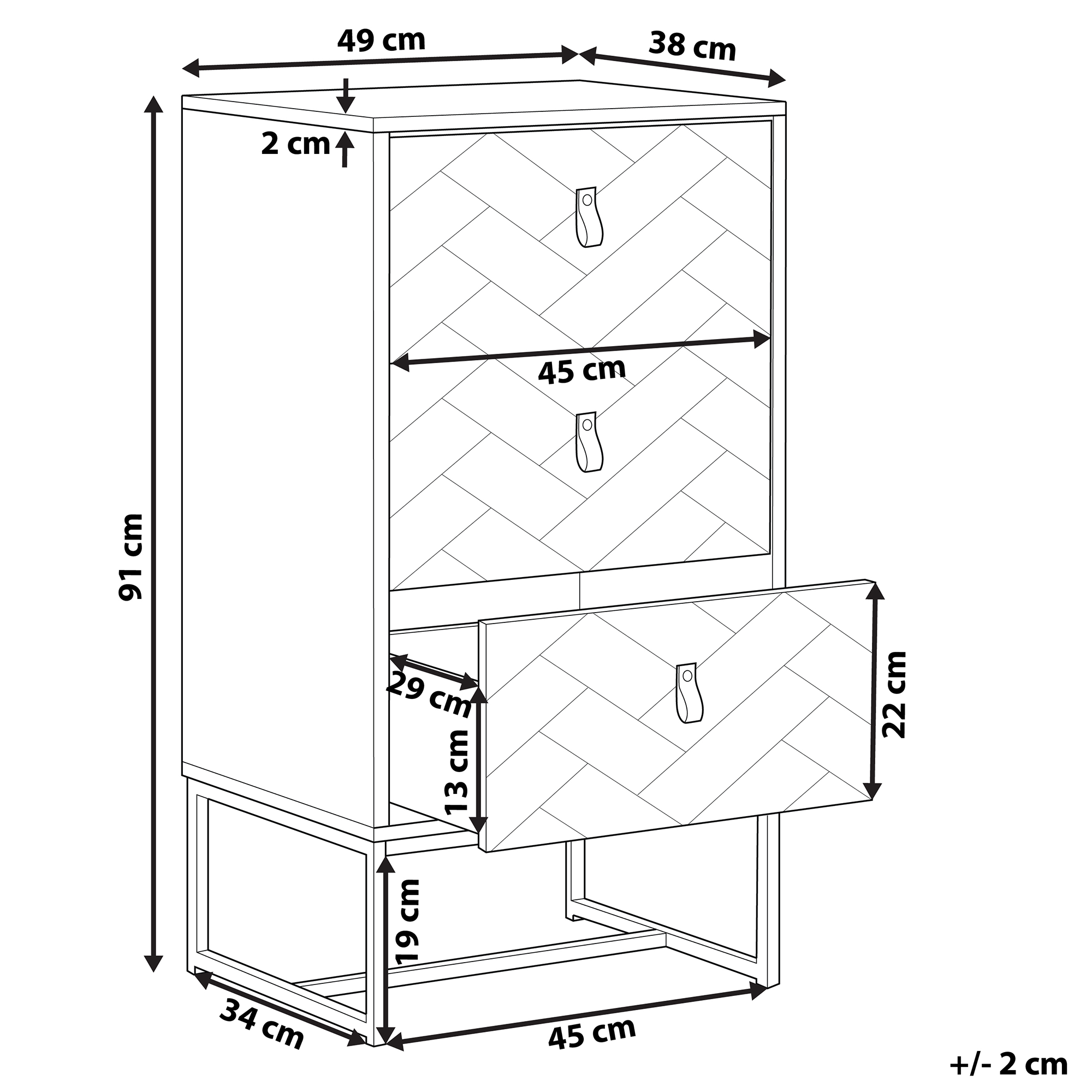 Moderni korkea lipasto. Tämä lipasto on loistava vaihtoehto, jos etsit perinteistä säilytysratkaisua modernilla ilmeellä. Tuote on valmistettu kestävästä MDF-levystä ja tukevista metallisista jaloista. Lipaston kolme laatikkoa tarjoavat runsaasti säilytystilaa. Tyylikkäät yksityiskohdat, kuten keinonahkaiset vetimet, tekevät lipastosta hienostuneen.