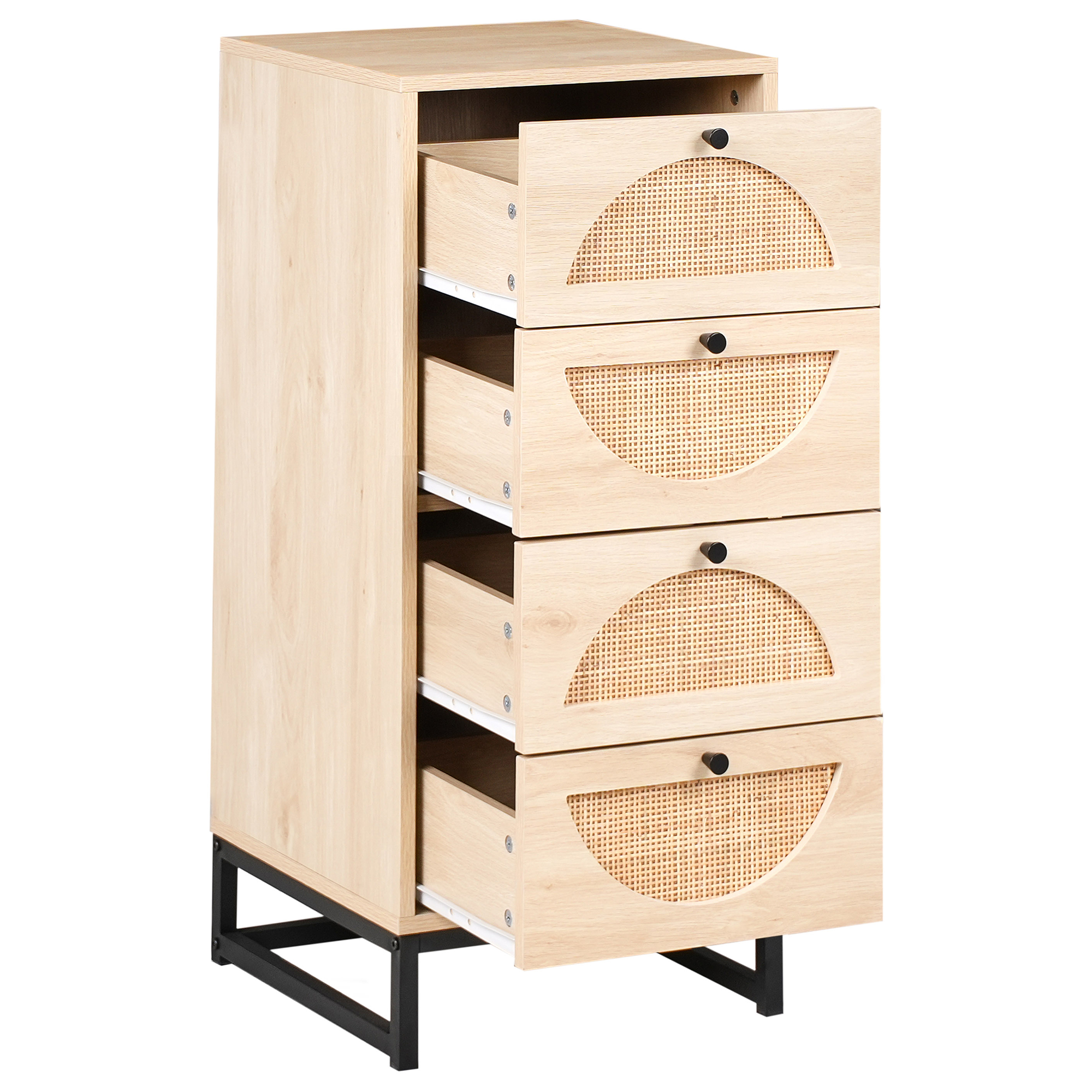Moderni lipasto rottinkisilla yksityiskohdilla. Lisää kotiin ripaus luonnollista charmia tällä tyylikkäällä 4-laatikollisella lipastolla. Kestävästä lastulevystä valmistetussa lipastossa on vaalea puumainen viimeistely, ja laatikoissa on luonnolliset rottinkiset yksityiskohdat, jotka antavat lämpimän, teksturoidun ilmeen. Tukevat mustat teräsjalat tarjoavat modernin kontrastin ja erinomaisen tuen. Täydellinen makuuhuoneisiin, eteisiin tai olohuoneisiin, hurmaten varmasti kaikki vieraat.