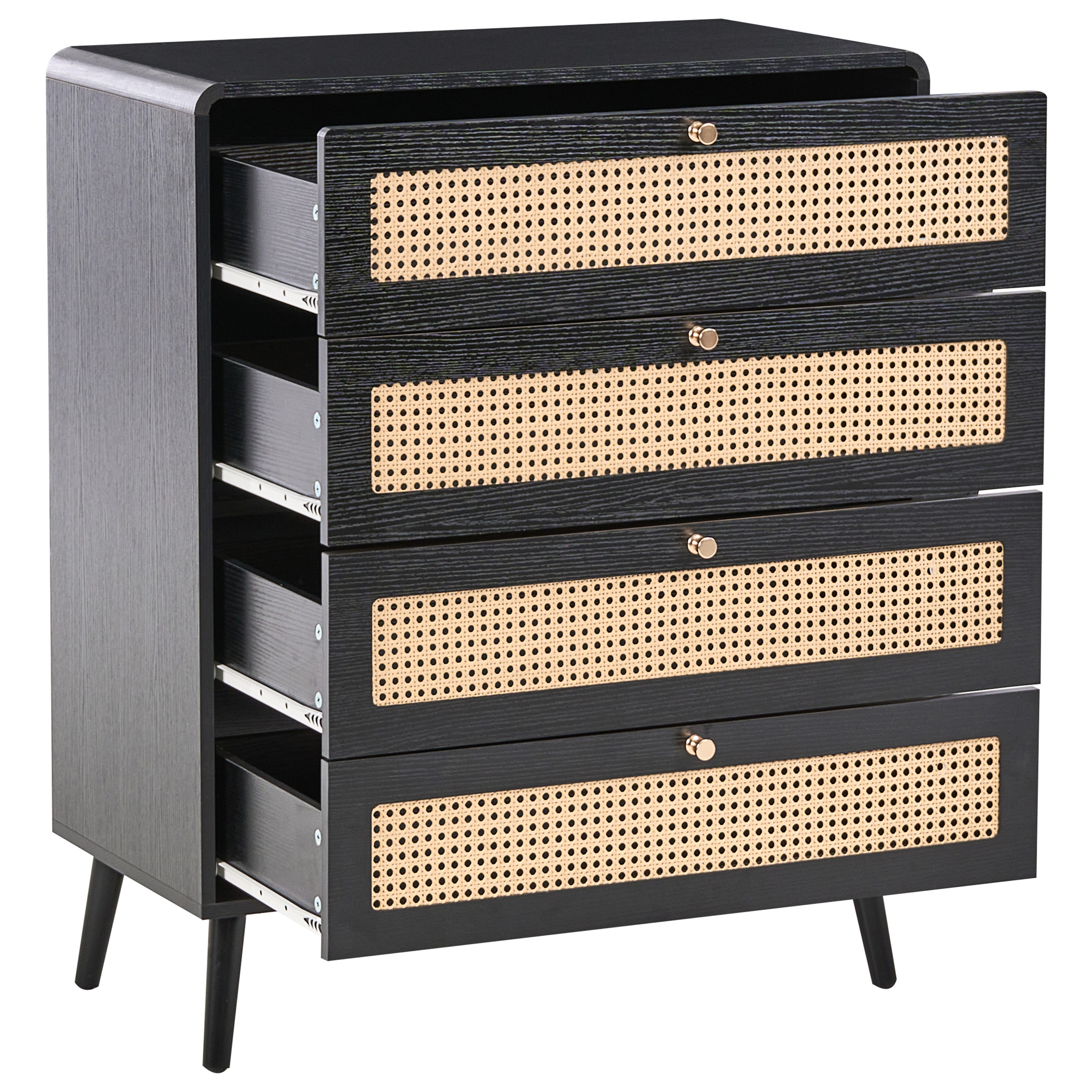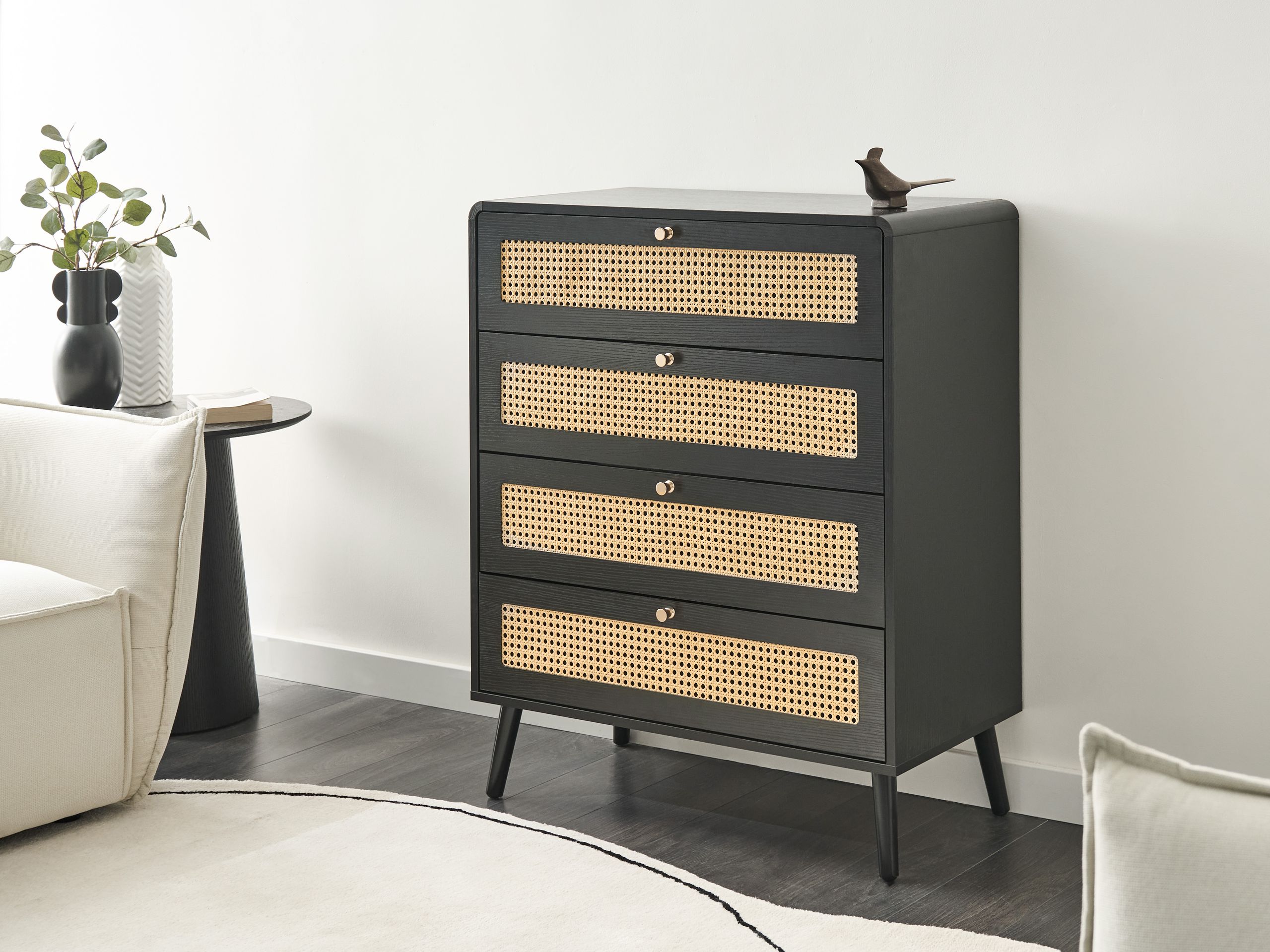 Boho-tyylinen lipasto wieniläispunotuilla korosteilla. Tämä tyylikäs lipasto on täydellinen yhdistelmä toiminnallisuutta ja boheemia muotoilua – ihanteellinen olohuoneeseen, makuuhuoneeseen tai eteiseen. Runko on valmistettu kestävästä MDF-levystä, ja siinä on neljä tilavaa laatikkoa, joiden etuosat on koristeltu punotulla polyrottingilla. Tukevissa mäntyjaloissa on suojatapit, jotka estävät lattian naarmuuntumisen. Elegantti ja käytännöllinen huonekalu, joka auttaa pitämään tilan siistinä.