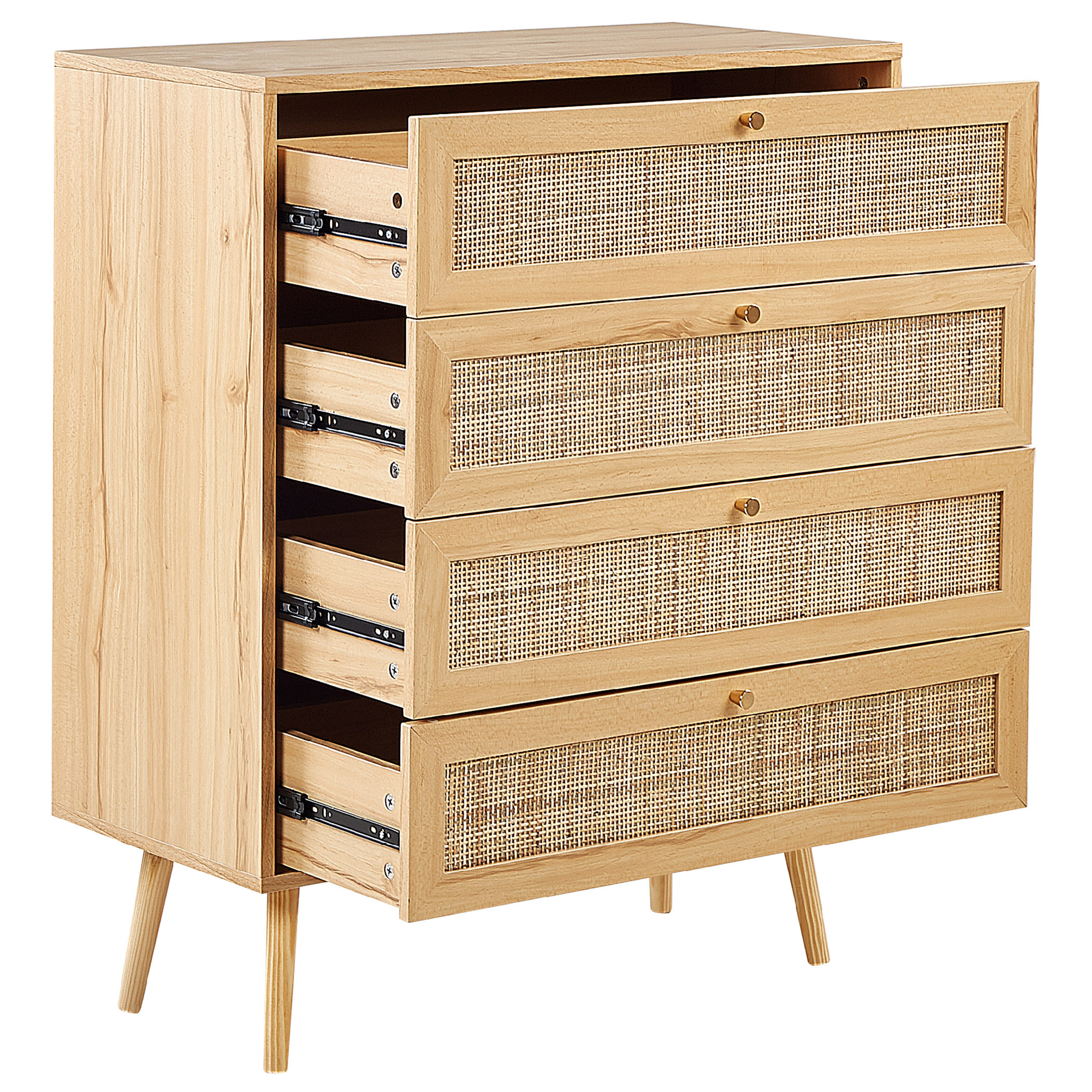 Boho-tyylinen lipasto rottinkipunoskorosteilla. Tämä lipasto on loistava lisä mihin tahansa olohuoneeseen, eteiseen tai makuuhuoneeseen minimalistisen muotoilunsa ansiosta. Neljällä laatikolla varustettu lipasto tarjoaa runsaasti säilytystilaa kirjoille, asiakirjoille sekä erilaisille tekstiileille. Leveä pöytätaso mahdollistaa maljakoiden sekä koriste-esineiden esillepanon. Kalusteen vaalea puusävy sulautuu loistavasti moniin erilaisiin sisustuksiin, tuoden siihen luonnollista ilmettä. Laatikoiden etuosassa olevat rottinkipunokset tuovat lipastoon boho-tyyliä. Runko on valmistettu lastulevystä sekä MDF:stä, ja tukevat jalat männystä.