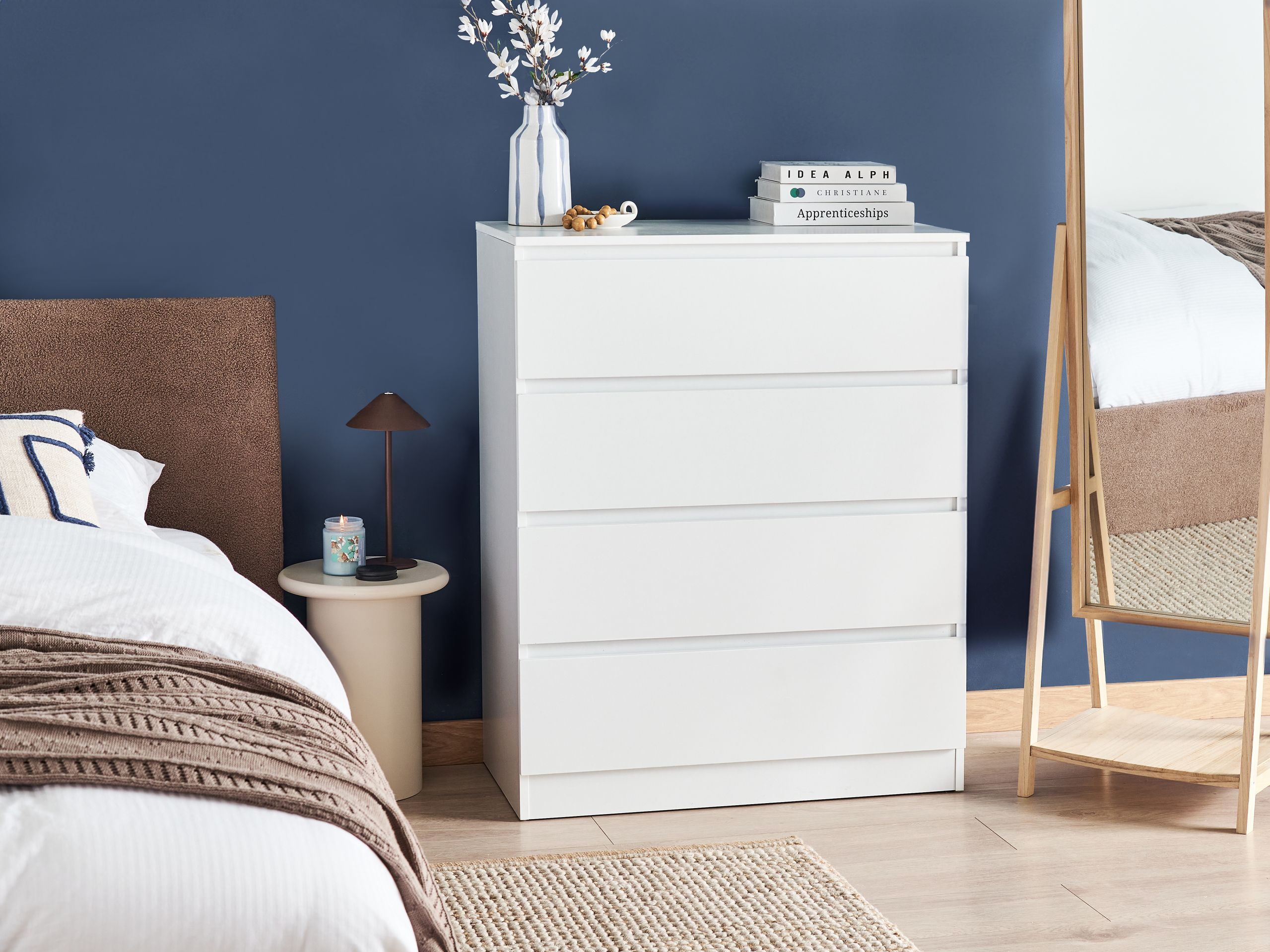 Skandinaavinen lipasto. Lisää makuuhuoneeseesi ajatonta minimalismia tällä käytännöllisellä lipastolla. Kestävistä ja helppohoitoisista materiaaleista valmistettu lipasto on suunniteltu kestämään jokapäiväistä käyttöä vaivattomasti. Skandinaavinen muotoilu tuo tilaan rauhallista ja modernia ilmettä, ja neljä tilavaa laatikkoa auttavat pitämään vaatteet tai tärkeimmät tavarat siistissä järjestyksessä. Se on älykäs valinta niille, jotka arvostavat puhtaita linjoja, toiminnallisuutta ja vaivatonta tyyliä.