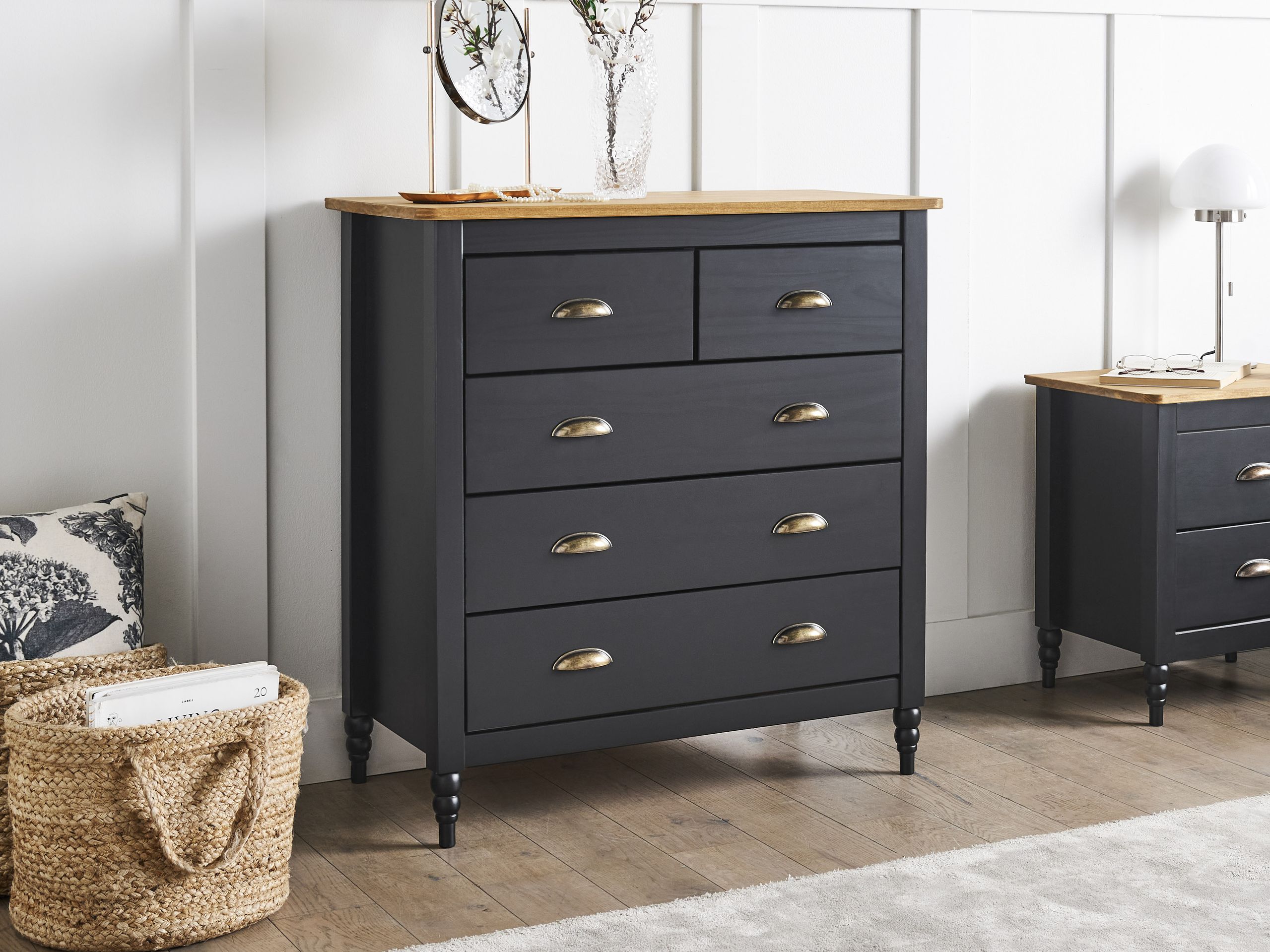 Skandinaavinen piironki laatikoilla. Tuo ripaus eleganssia ja käytännöllisyyttä makuuhuoneeseesi tällä viehättävällä lipastolla. Elegantin mustaksi maalatut etuosa, sivut ja jalat on valmistettu tukevasta männystä, jota täydentävät kestävästä sinkkiseoksesta, zamakista, valmistetut vetimet. Muotoilunsa ansiosta se sulautuu sekä moderniin että perinteiseen sisustukseen. Sirot, klassiset jalat korostavat ajatonta ilmettä, ja viisi tilavaa vetolaatikkoa tarjoavat paikan vaatteille tai kodin tarvikkeille, pitäen tilan järjestyksessä. Avaralle vaalealle pöytälevylle mahtuu pöytävalaisin tai koristeita, mikä tekee lipastosta sekä toimivan että kauniin.