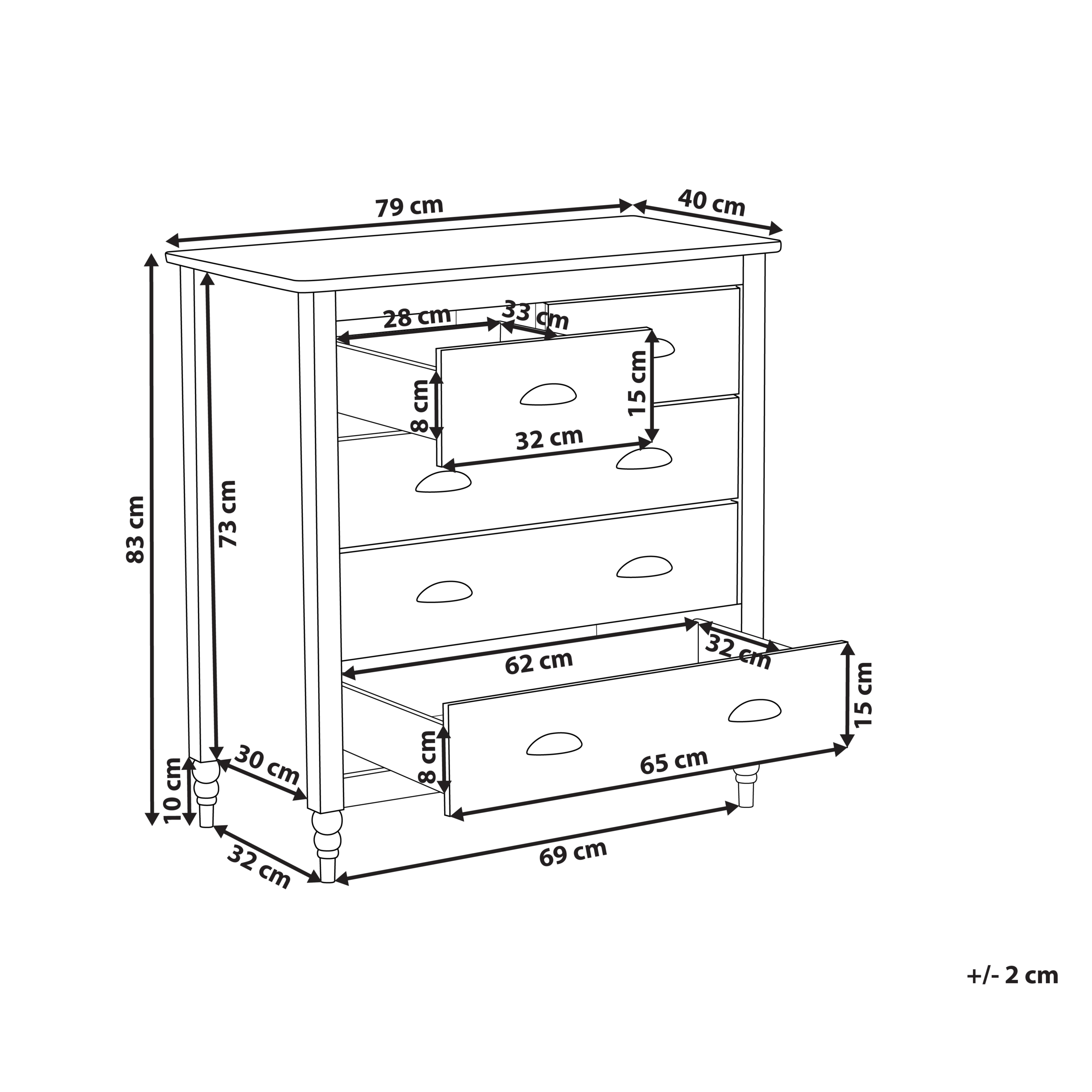 Skandinaavinen piironki laatikoilla. Tuo ripaus eleganssia ja käytännöllisyyttä makuuhuoneeseesi tällä viehättävällä lipastolla. Raikkaan valkoiseksi maalatut etuosa, sivut ja jalat on valmistettu tukevasta männystä, jota täydentävät kestävästä sinkkiseoksesta, zamakista, valmistetut vetimet. Muotoilunsa ansiosta se sulautuu sekä moderniin että perinteiseen sisustukseen. Sirot, klassiset jalat korostavat ajatonta ilmettä, ja viisi tilavaa vetolaatikkoa tarjoavat paikan vaatteille tai kodin tarvikkeille, pitäen tilan järjestyksessä. Avaralle vaalealle pöytälevylle mahtuu pöytävalaisin tai koristeita, mikä tekee lipastosta sekä toimivan että kauniin.