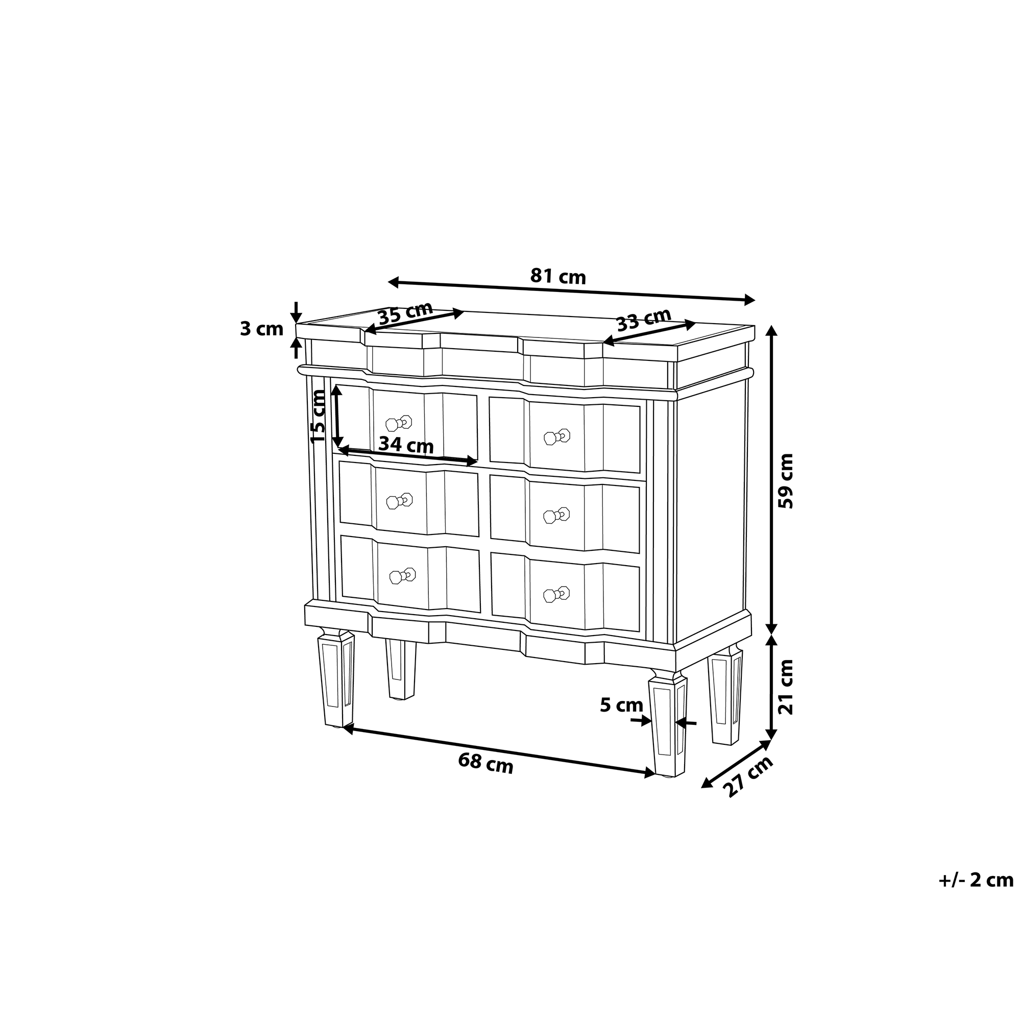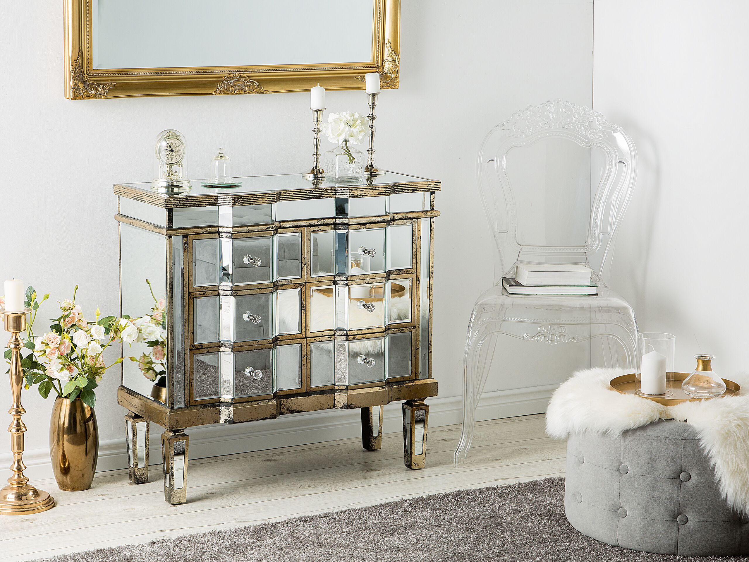 Ylellinen peilaava lipasto kultaisilla korosteilla. Täydellinen lipasto, jonka avulla lisäät vaivattomasti ylellisyyden tunnetta huoneeseen kuin huoneeseen. Lipastossa on 6 laatikkoa ja kaunis peililasinen pinta, joka heijastaa valoa kauniisti ja avartaa tilaa. Upeat kultaiset yksityiskohdat viimeistelevät lipaston ilmeen.