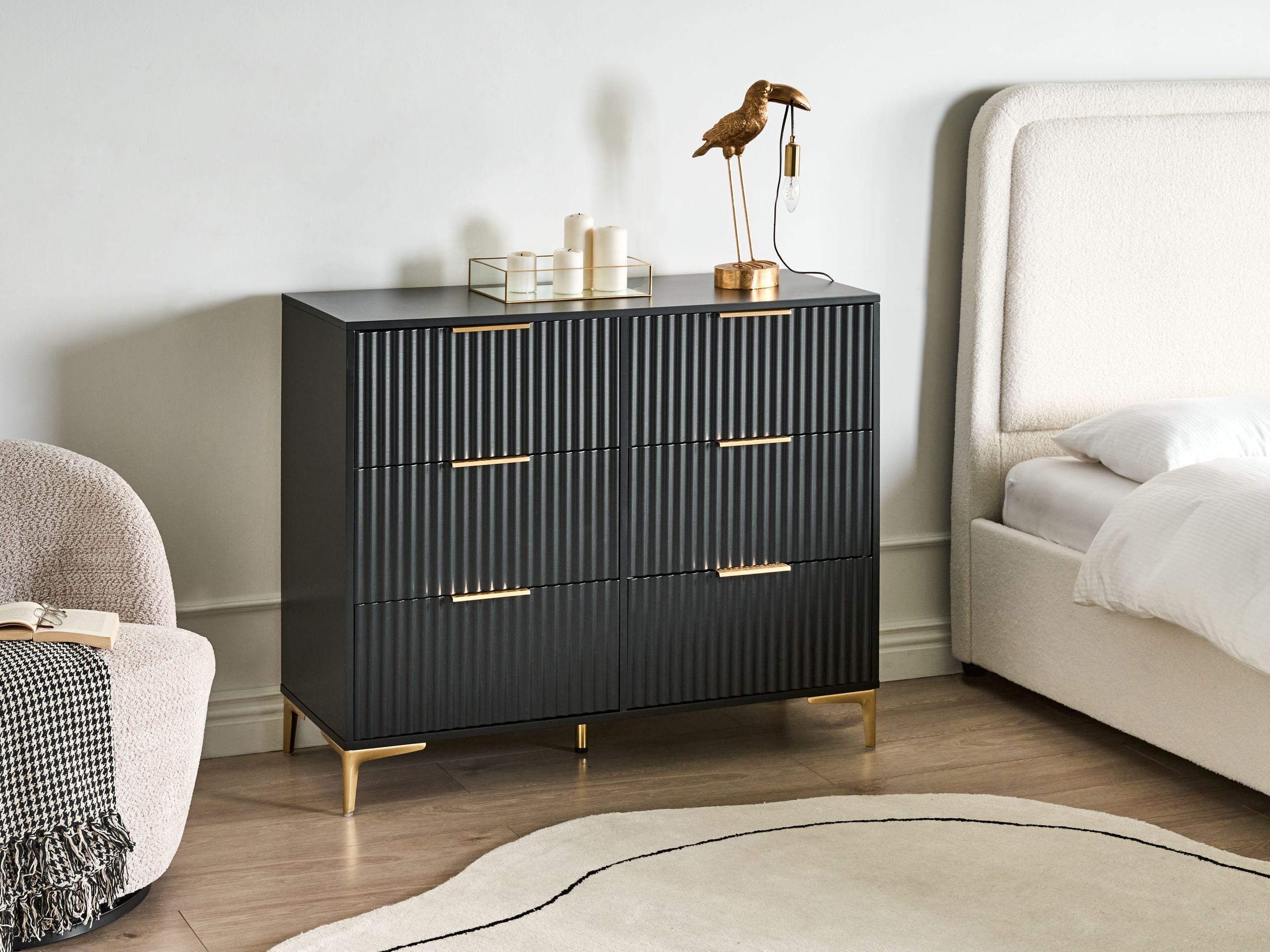 Moderni lipasto uurretuilla vetolaatikoilla. Tämä retrohenkinen lipasto tuo tyylikästä ilmettä mihin tahansa makuuhuoneeseen tai olohuoneeseen. Siinä on kuusi laatikkoa, joiden etuosaa koristavat uurteet lisäävät vintage-viehätystä muuten moderniin muotoon. Elegantit kullansävyiset rautajalat ja -vetimet lisäävät hienostuneisuutta, tarjoten samalla tukevan tuen. Jokaisessa laatikossa on runsaasti säilytystilaa vaatteille, tekstiileille ja henkilökohtaisille tavaroille, pitäen tilan järjestyksessä. Ainutlaatuinen muotoilu ja kauniit yksityiskohdat tekevät siitä näyttävän lisän, joka täydentää vaivattomasti erilaisia sisustustyylejä.