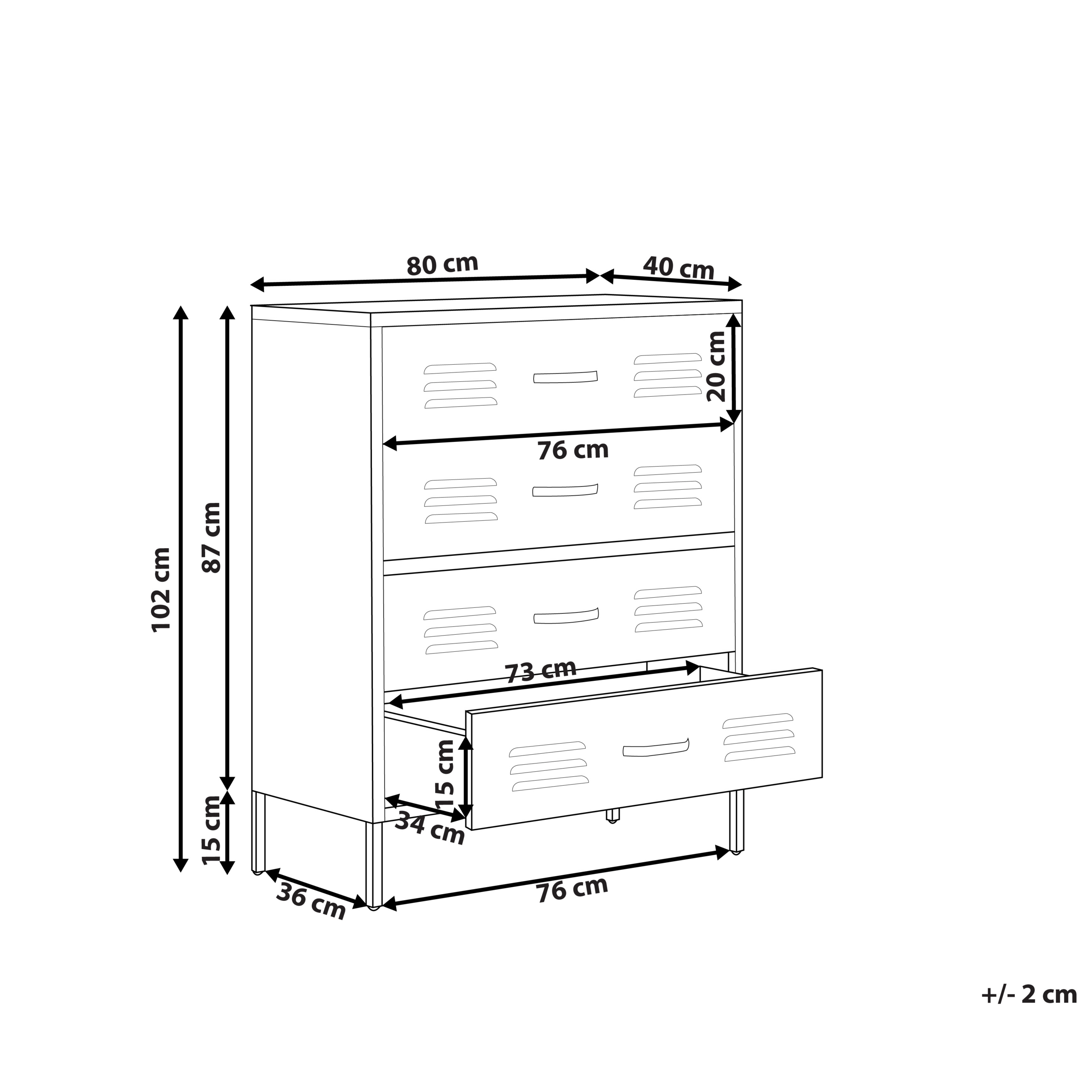 Industriaalinen toimistokaappi. Tämä käytännöllinen, industriaalinen lipasto näyttää hyvältä monissa eri sisustuksissa. Sen runko on valmistettu tukevasta teräksestä, mikä tekee siitä erityisen kestävän. Laadukas pinnoite tekee pinnoista helppohoitoisia ja parantaa lipaston korroosionkestävyyttä. Siinä on neljä tilavaa laatikkoa, jotka tarjoavat tilaa tekstiileille, toimistotarvikkeille ja muille tarpeellisille esineille. Minimalistisen muotoilunsa ansiosta lipasto on upea lisä niin makuuhuoneeseen, olohuoneeseen kuin työhuoneeseenkin.