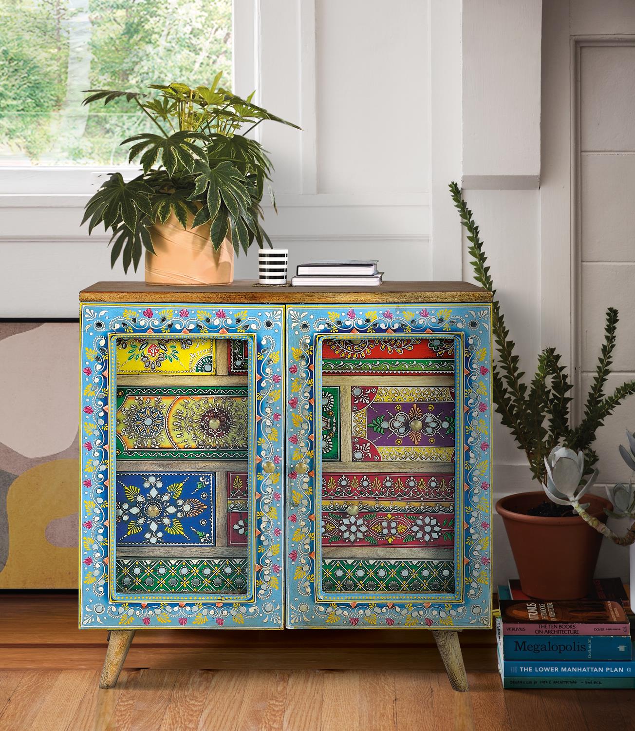 Elegantti 7-laatikkoinen, 2-ovinen lipasto, joka on valmistettu mangopuusta ja käsinmaalattu, tarjoaa luonnollista viehätysvoimaa. Siinä on sekoitus luonnon- ja monivärisiä sävyjä. Sen mitat ovat 62 x 60 x 30 cm ja paino 25 kg. Pakkauksen mitat ovat 73 x 67 x 39 cm. Koska kyseessä on käsintehty luonnonpuukappale, siinä saattaa säilyä alkuperäiset oksankohdat ja syykuviot, mikä johtaa pieniin värivaihteluihin.