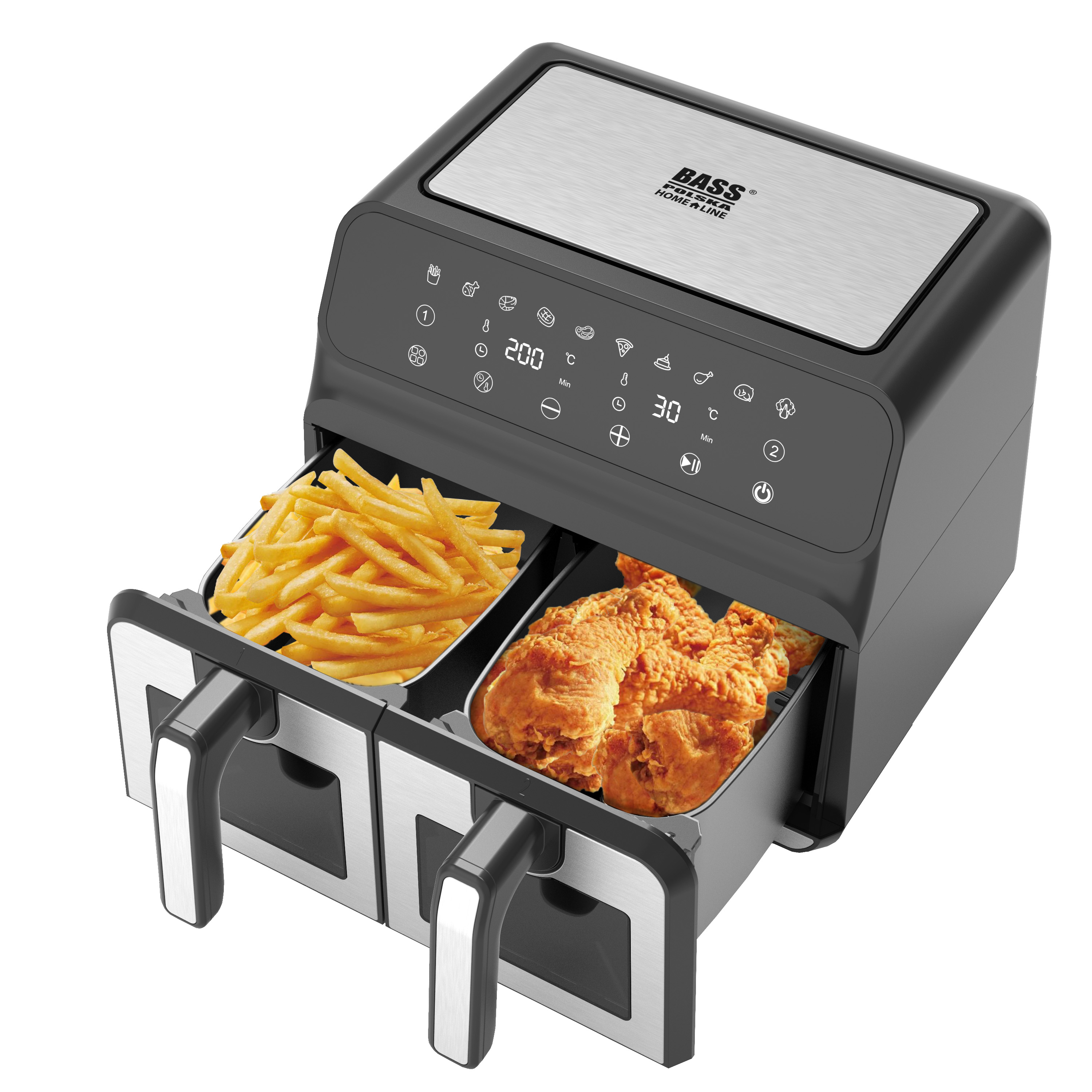 Bass Polska Air Fryer 9L kaksoiskorilla on kätevä ratkaisu terveellisten ja maukkaiden aterioiden valmistukseen. Laajan lämpötila-alueensa ja suuren tilavuutensa ansiosta sillä voi valmistaa monenlaisia ruokia säilyttäen niiden luonnollisen maun ja ravintoarvon.