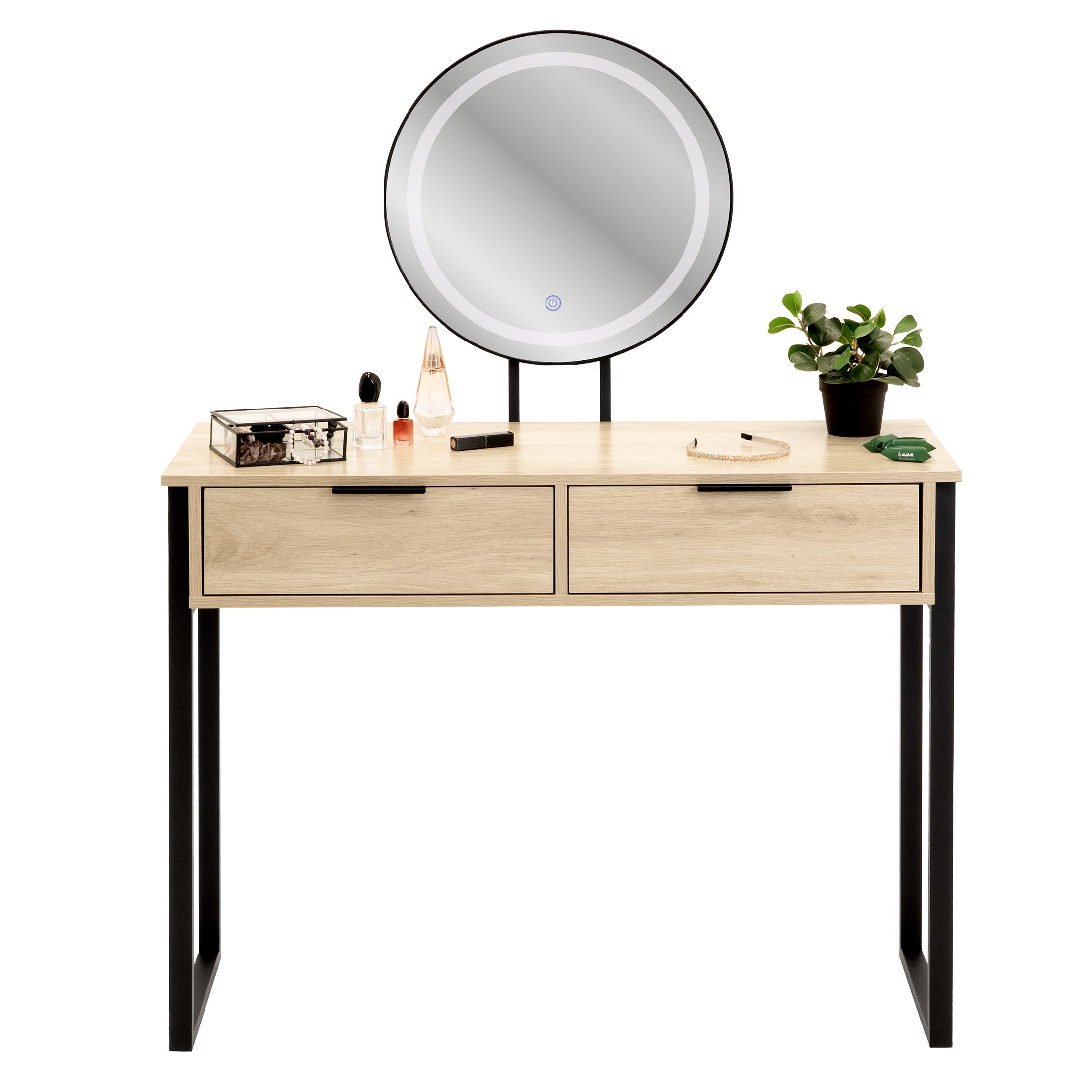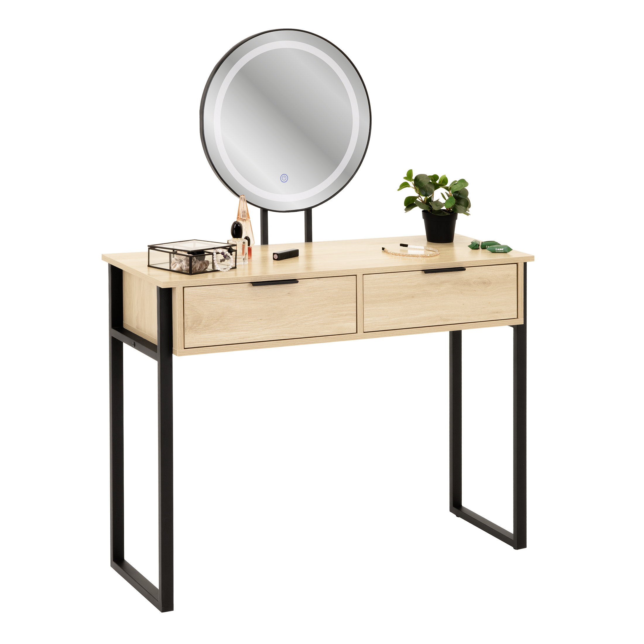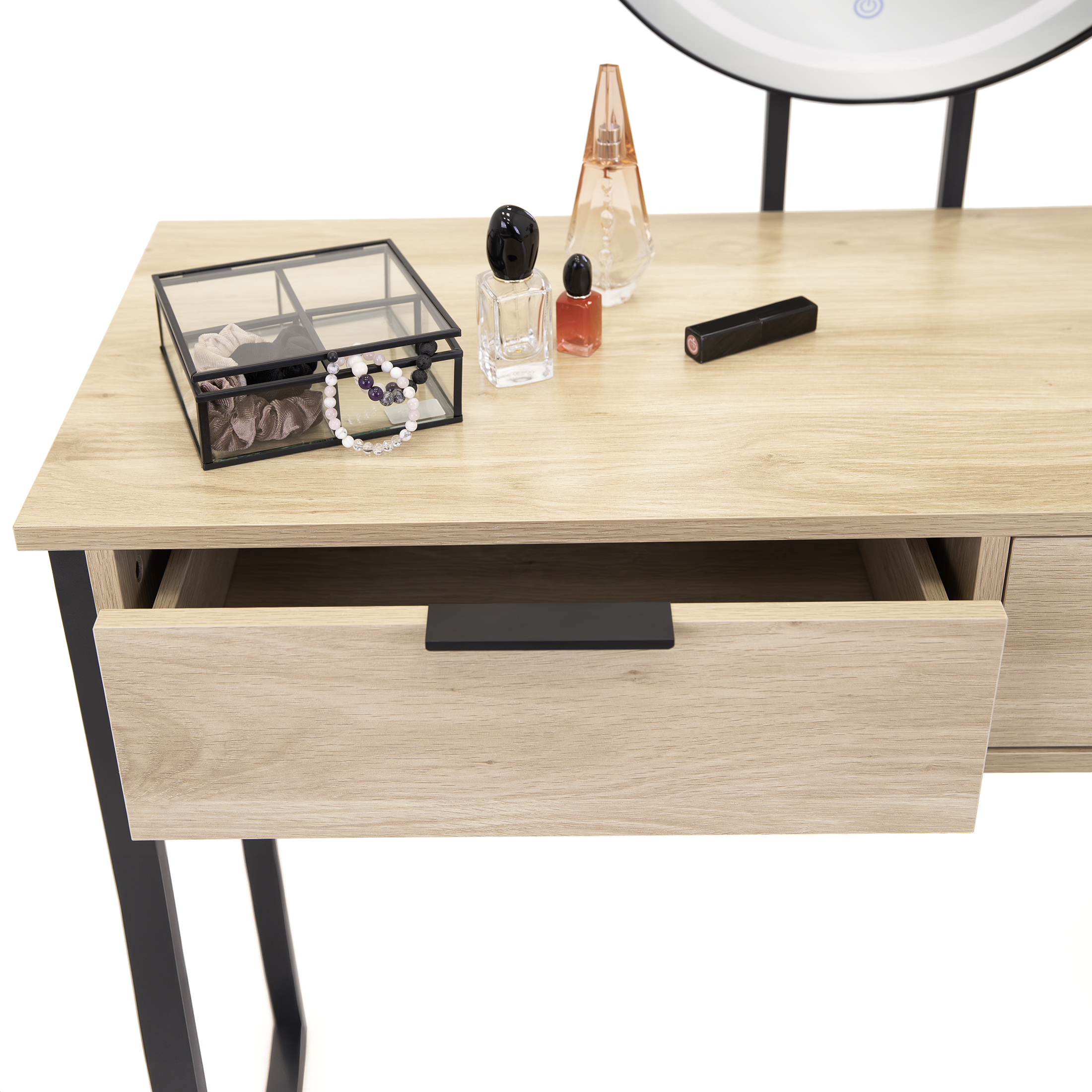 Tämä loft-tyylinen kosmetiikkapöytä on ihanteellinen ratkaisu helpottamaan päivittäistä meikkausrutiinia. Sen muotoilu yhdistää modernin ja klassisen tyylin ja täydentää mitä tahansa sisustusta. Kaksi laatikkoa tarjoaa säilytystilaa suurille kosmetiikkamäärille ja henkilökohtaisille tavaroille, ja LED-valaistu peili takaa täydelliset olosuhteet meikkaamiseen. Lisäksi peilin korkeus on säädettävissä.
