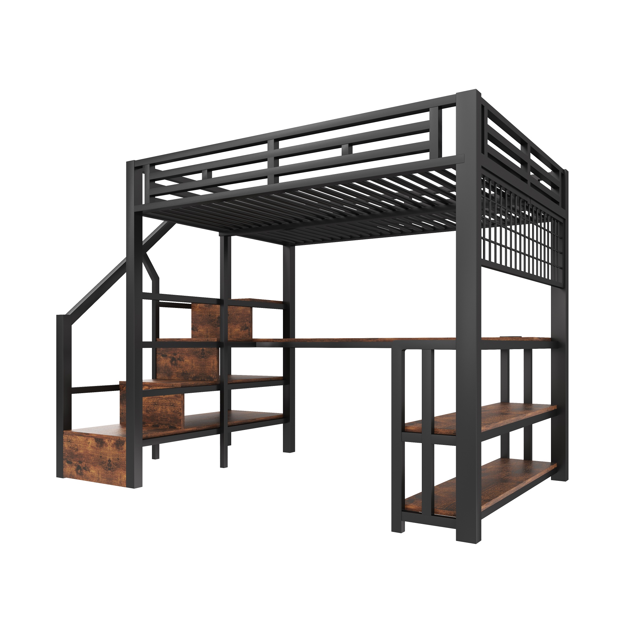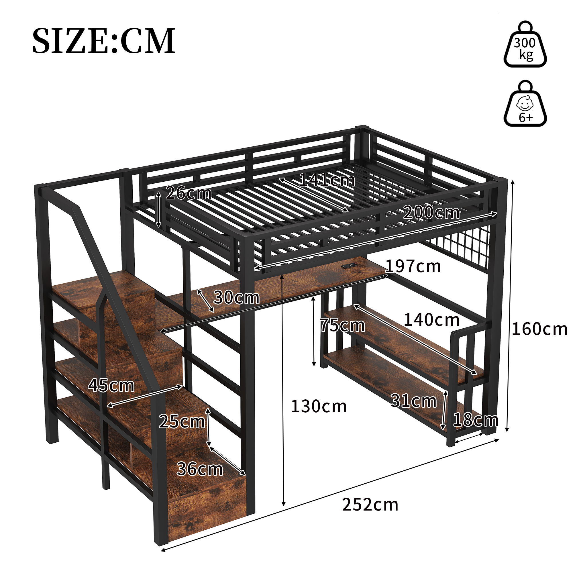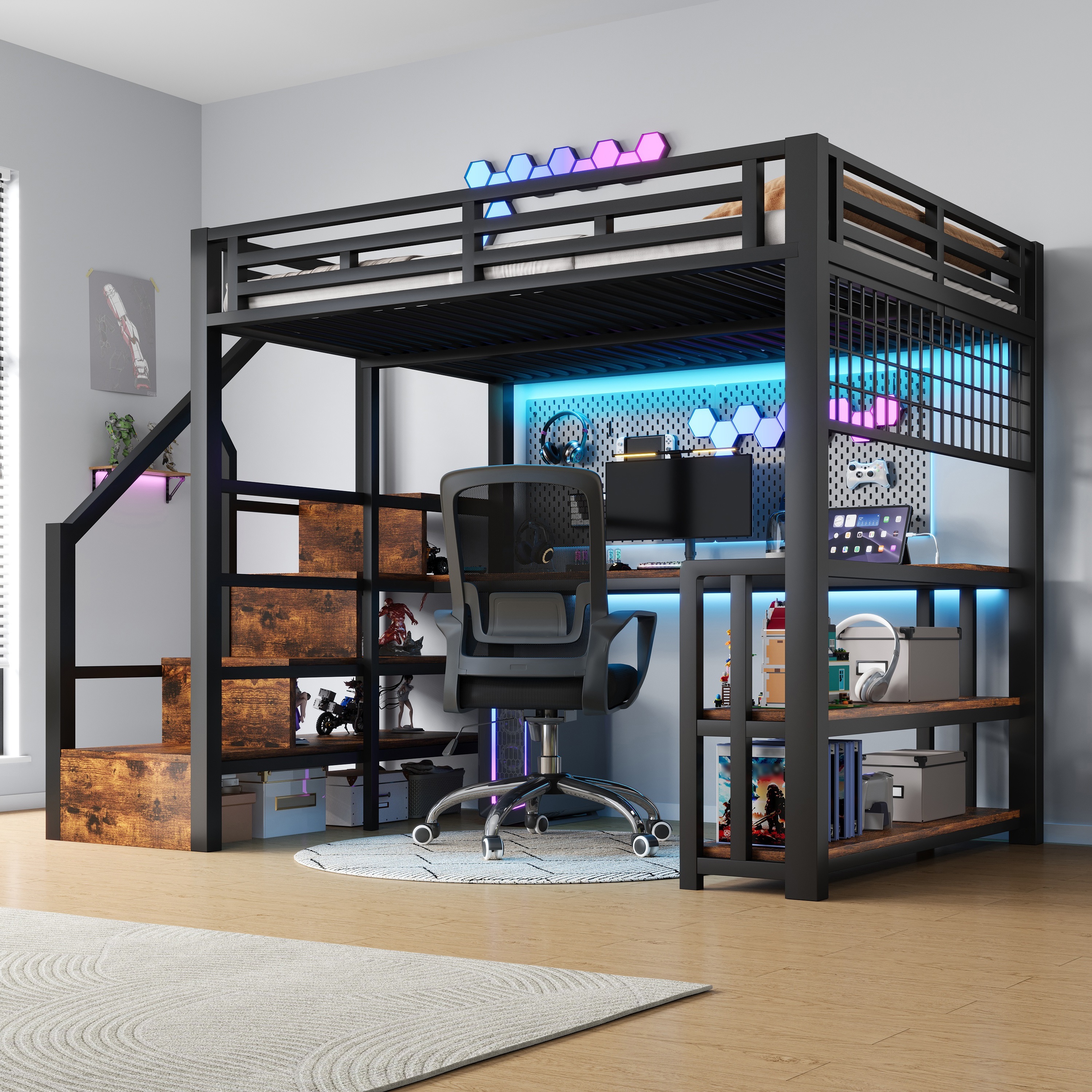 Loft-sänky, 140x200 cm, metalli, hyllyt, LED, työpöytä, USB, Type-C, musta