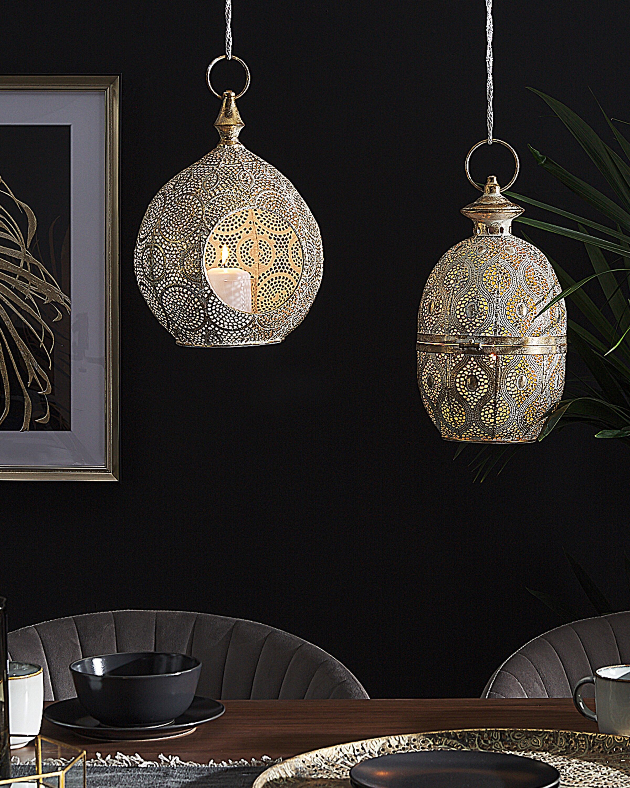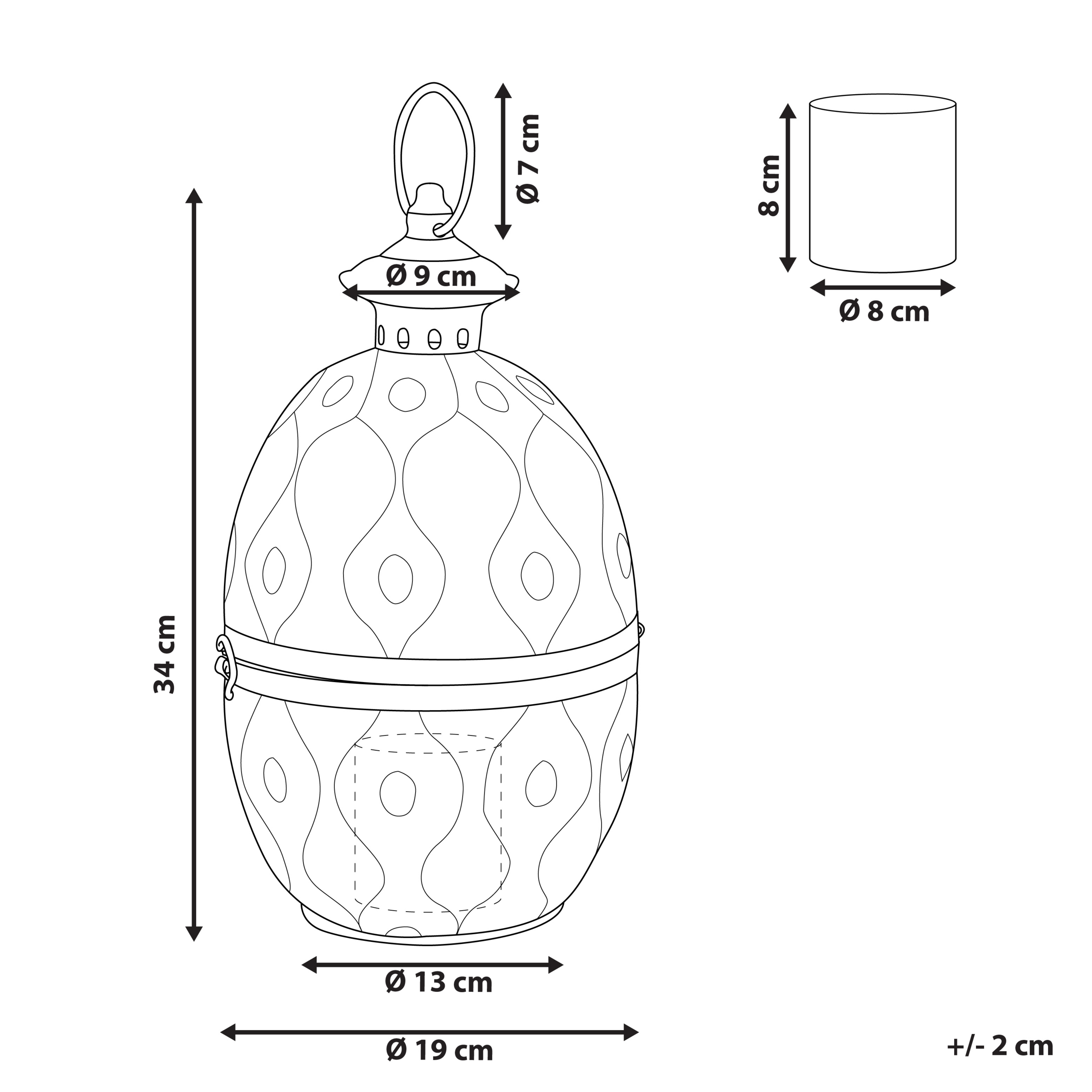 Koristeellinen kynttilälyhty. Tämä elegantti ovaali lyhty on trendikäs koriste, joka sopii erityisesti moderneihin ja boho-tyylisiin sisustuksiin. Lyhty ei ainoastaan tarjoa hellävaraista kynttilänvaloa, vaan se myös levittää tilaan kauniita varjoja seinämien rei'istä. Se on valmistettu ohuesta mutta kestävästä metallista. Kultainen väri, kulunut viimeistely ja kaunis kuviointi huokuvat itämaista tunnelmaa. Lyhty voidaan asettaa helposti myös roikkumaan katosta yläosan renkaan ansiosta.
