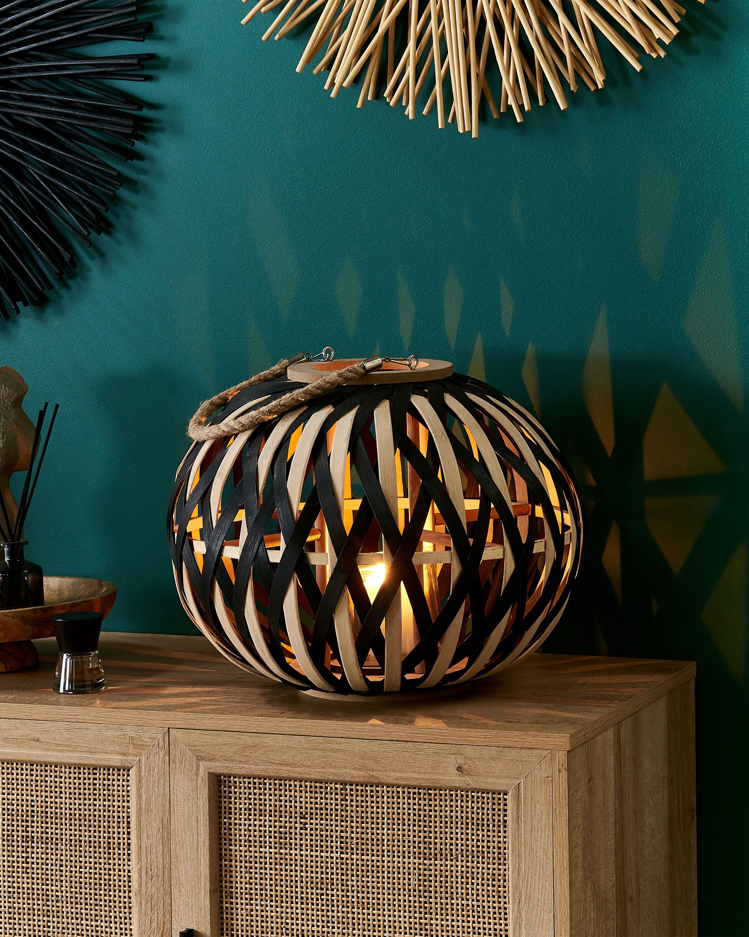 Boho-tyylinen lyhty kynttilälle. Lisää olohuoneeseen tai makuuhuoneeseen ainutlaatuista tunnelmaa ja aseta tämä näyttävä lyhty näkyvälle paikalle. Se on valmistettu käsin luonnollisen ja mustan värisistä bambupaloista, jotka luovat mielenkiintoisen avoimen rakenteen. Lyhdyssä on tyylikäs, kudottu kahva, jonka avulla sitä on helppo siirtää paikasta toiseen. Mukana tulevan lasisen kynttilänpidikkeen avulla asetat kynttilän lyhdyn sisään helposti vahingoittamatta sitä.