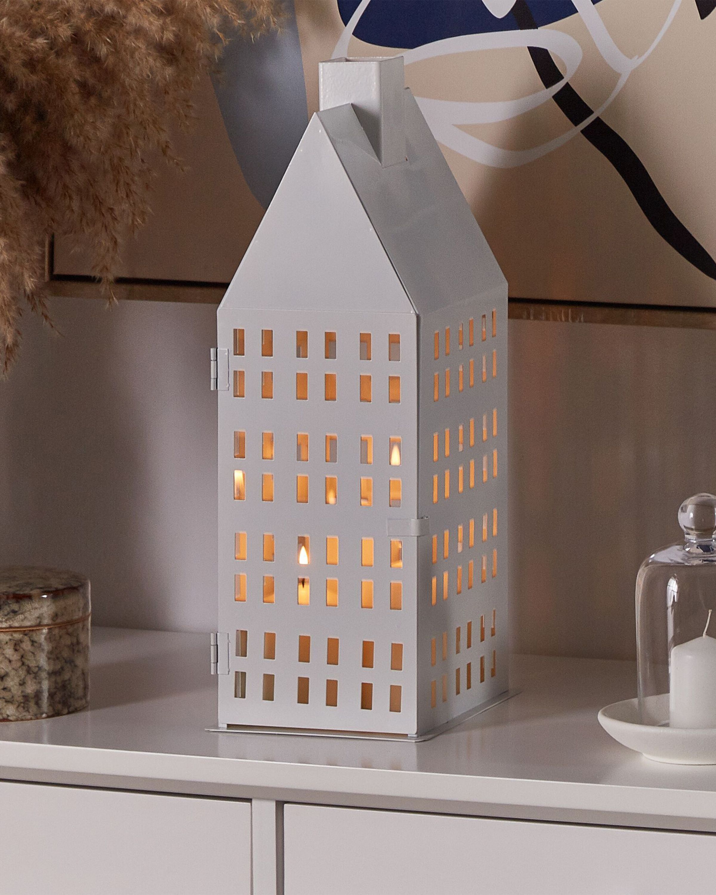Moderni talon muotoinen kynttilälyhty. Tämä talonmuotoinen metallista valmistettu lyhty on kauniin minimalistinen mutta kuitenkin myös koristeellinen. Kynttilän valo heijastuu lyhdyn sisältä seinille kauniisti lukuisten ikkunoiden kautta. Valkoisen värin ja yksinkertaisen muotoilun ansiosta lyhty on helppo yhdistää monenlaisiin sisustuksiin.