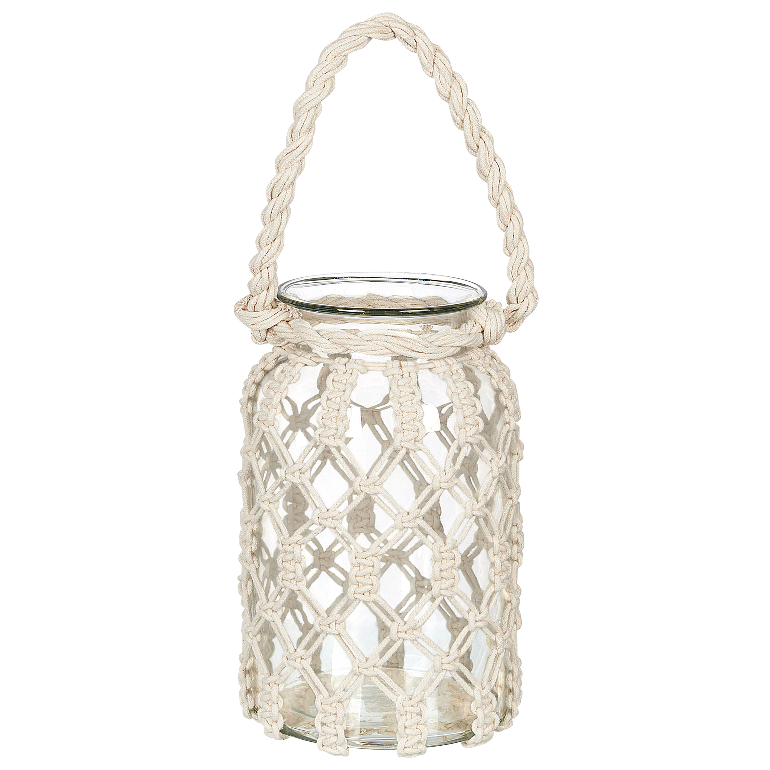 Boho-tyylinen makramee lyhty. Kohenna sisustusta ja tuo siihen boho-tunnelmaa ainutlaatuisella lyhdyllä, joka piristää tilan kuin tilan ilmettä. Purkkimainen lasilyhty on päällystetty puuvillamakrameella, jonka käsintehty, pitsimäinen kudos sopii kauniisti yhteen erilaisten luonnollisten asusteiden ja koristeiden kanssa. Aseta lyhdyn sisään korkea pilarikynttilä ja nauti seinille heijastuvien varjojen upeista visuaalisista vaikutuksista sekä tunnelmallisesta valosta.